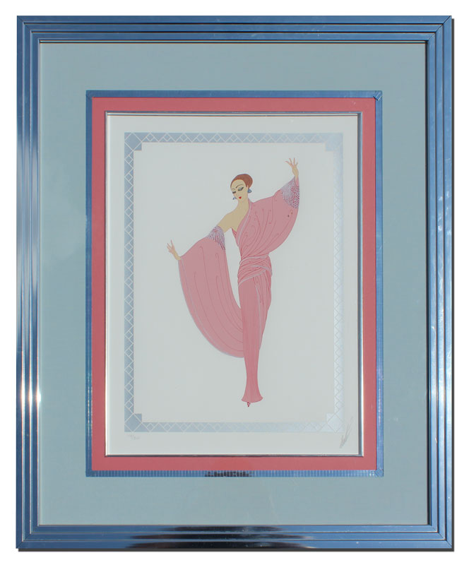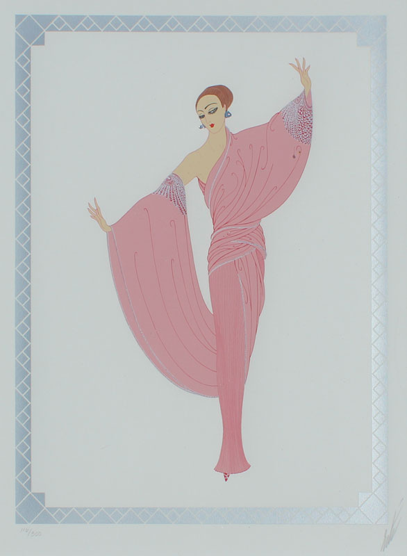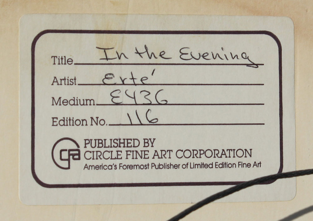 ERTE SERIGRAPH ''IN THE EVENING'': Sight size 34 1/4'' x 25 1/4'', pencil signed lower right, numbered lower left 150/300, custom frame and mat, 32'' x 26 1/2'', Circle Gallery label verso.