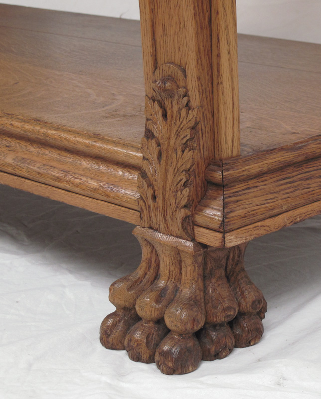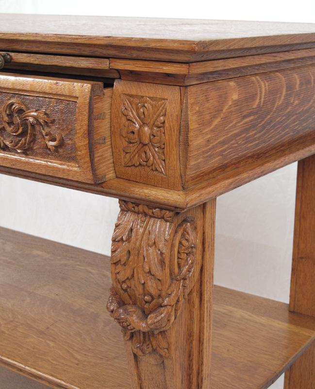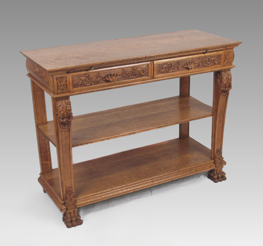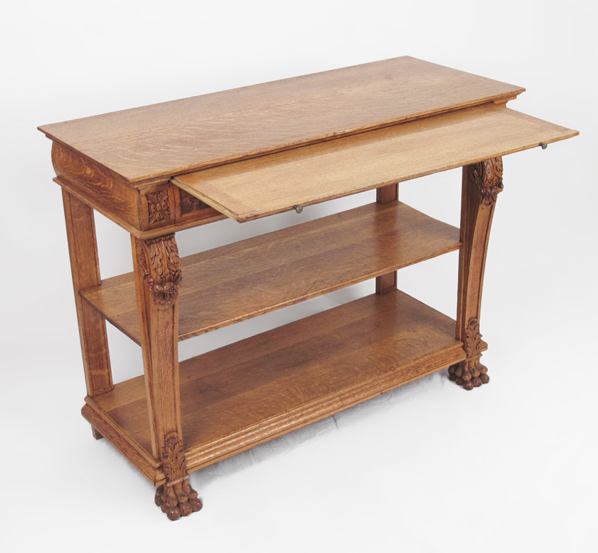 LATE VICTORIAN CARVED OAK SERVER: Three tier serving stand with extra pull out extension leaf above the two carved front drawers, carved stiles, paw feet. Measures approx. 37'' tall x 46'' x 20''. Refinished condition.
