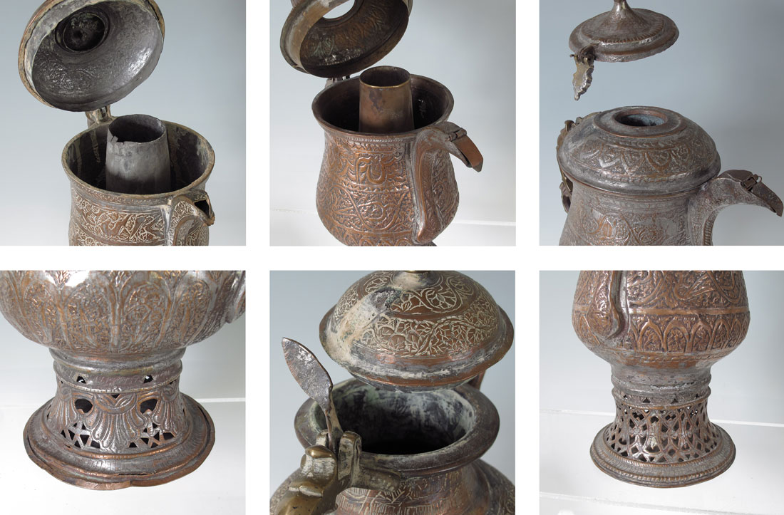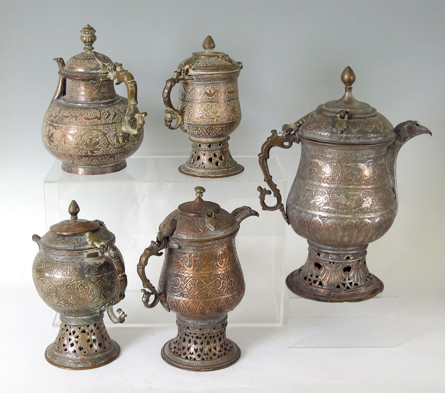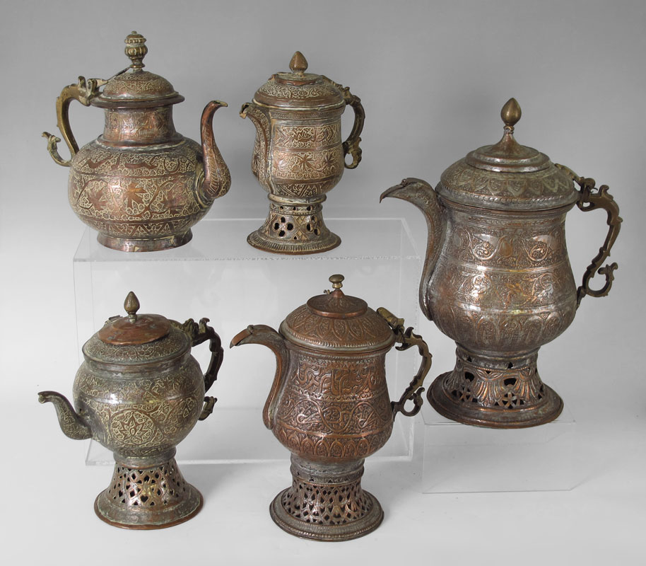 COLLECTION OF 5 PERSIAN BRASS KETTLES: 5 mixed metal, brass, copper and silver? wash. Embossed foliate motifs, 3 are of one pattern, 2 of another. Largest measures 16 1/2'' h. x 13''.