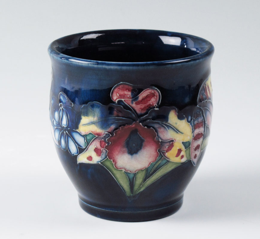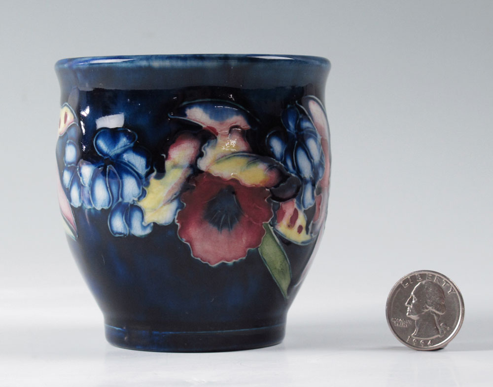 DIMINUTIVE MOORCROFT ORCHID VASE: Signed on base, obscured mark. Measures 3 1/2'' h. x 3 3/8''.