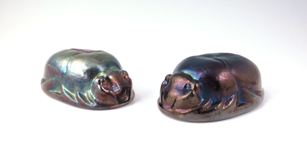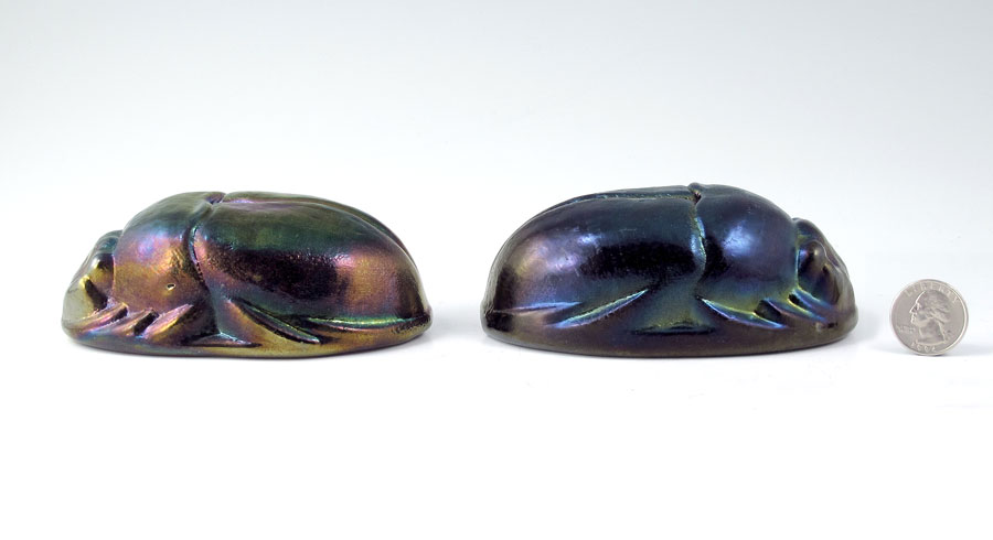 STUDIO IRIDESCENT ART GLASS SCARAB PAPERWEIGHTS: Unmarked, 1 5/8'' h. x 5'' x 3''.
