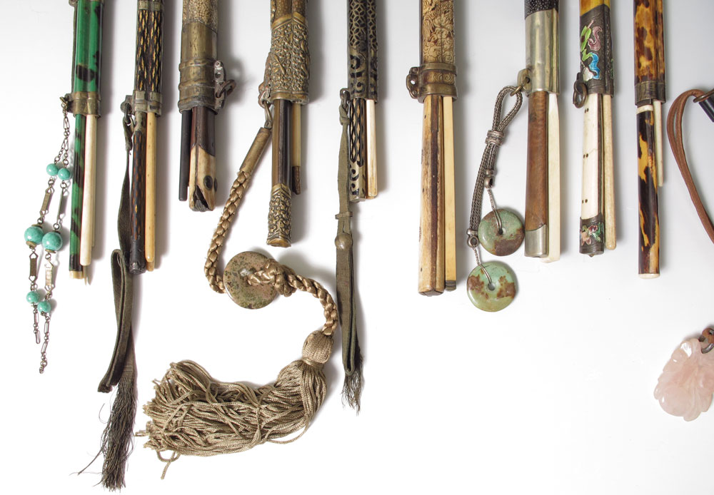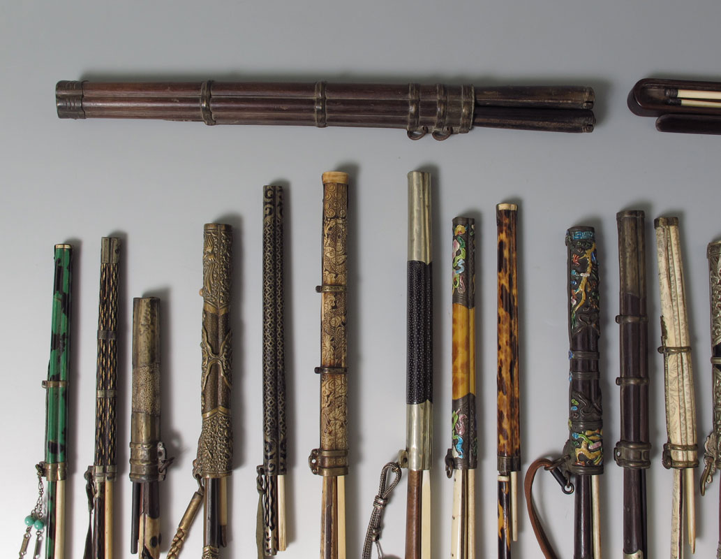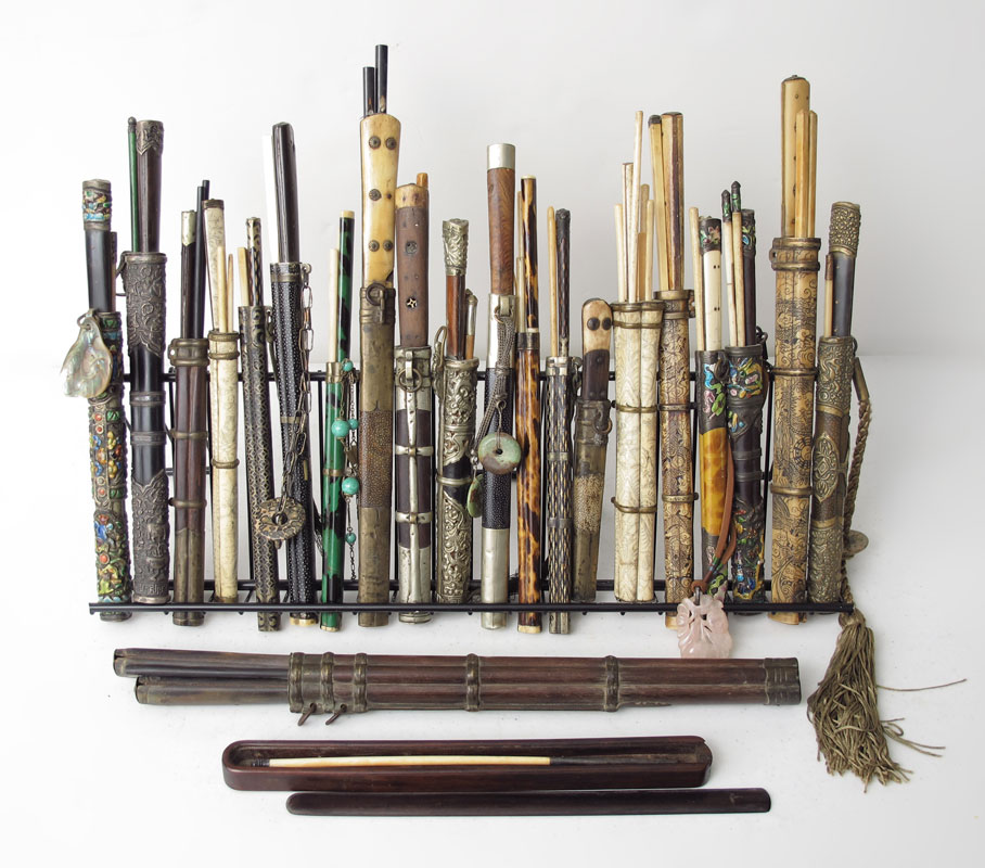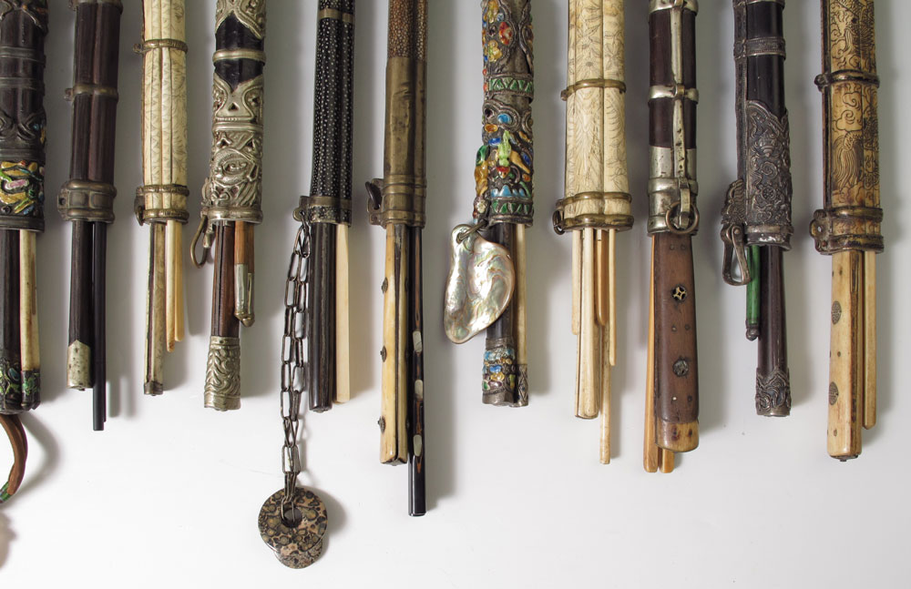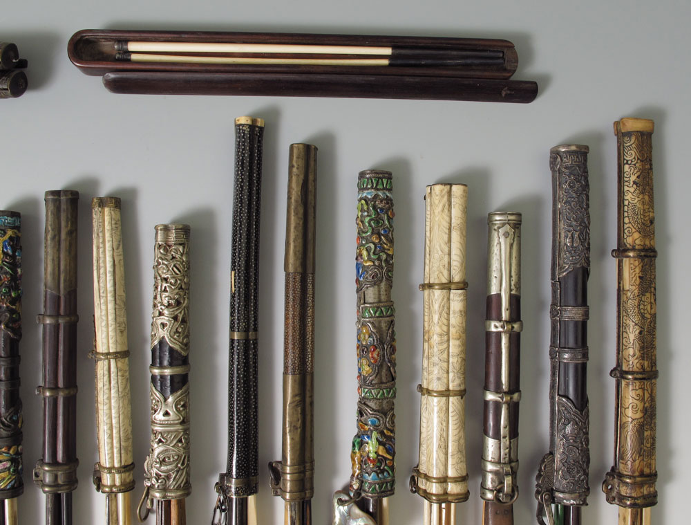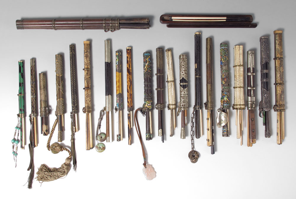 LIFE LONG COLLECTION OF CHOPSTICK CASES AND CONTENTS: 21 cases with implements...chopsticks, knives, and scrapers. There are enamel, carved wood, bone, ivory and metal. Many with stone charms. Sold as a collection.