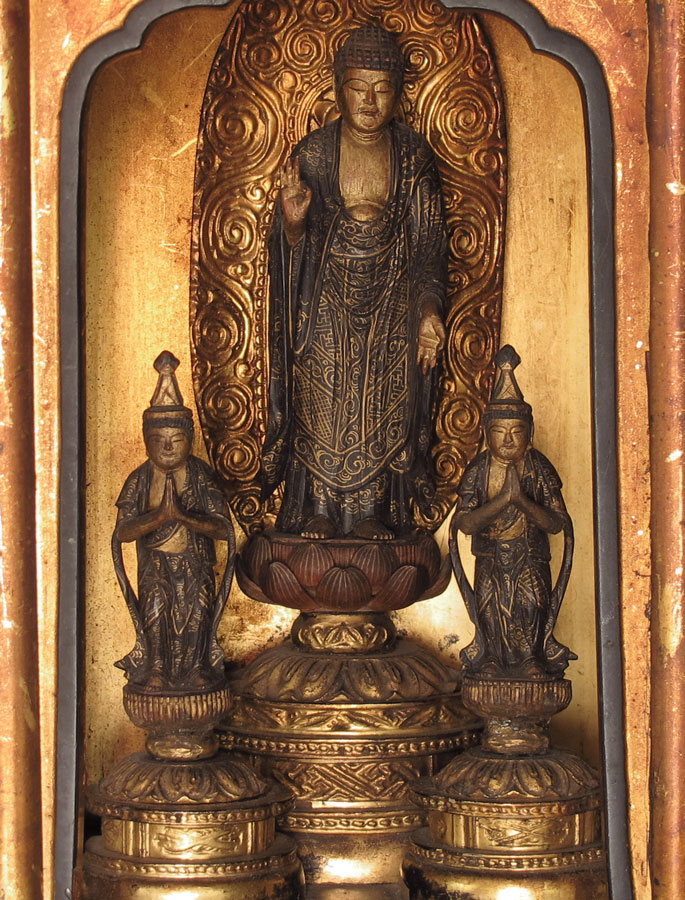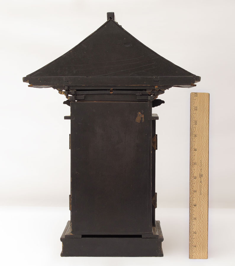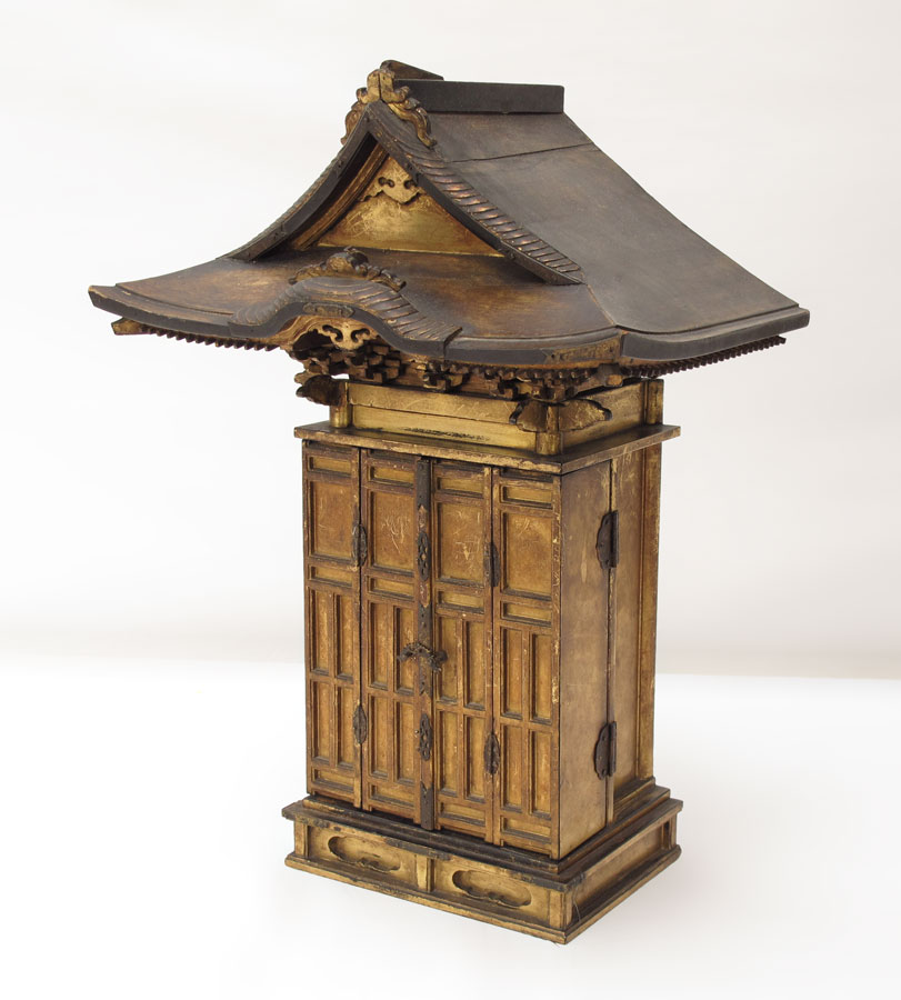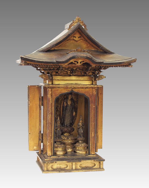 ASIAN CARVED GILT BUDDHA TABLE SHRINE: Carved and gilded shrine in the form of a temple. Hinged doors open to reveal carving of standing Buddha on lotus pedestal and 2 standing followers, affixed to temple. Measures 18'' h. x 13'' x 8 1/2''. Age unknown.