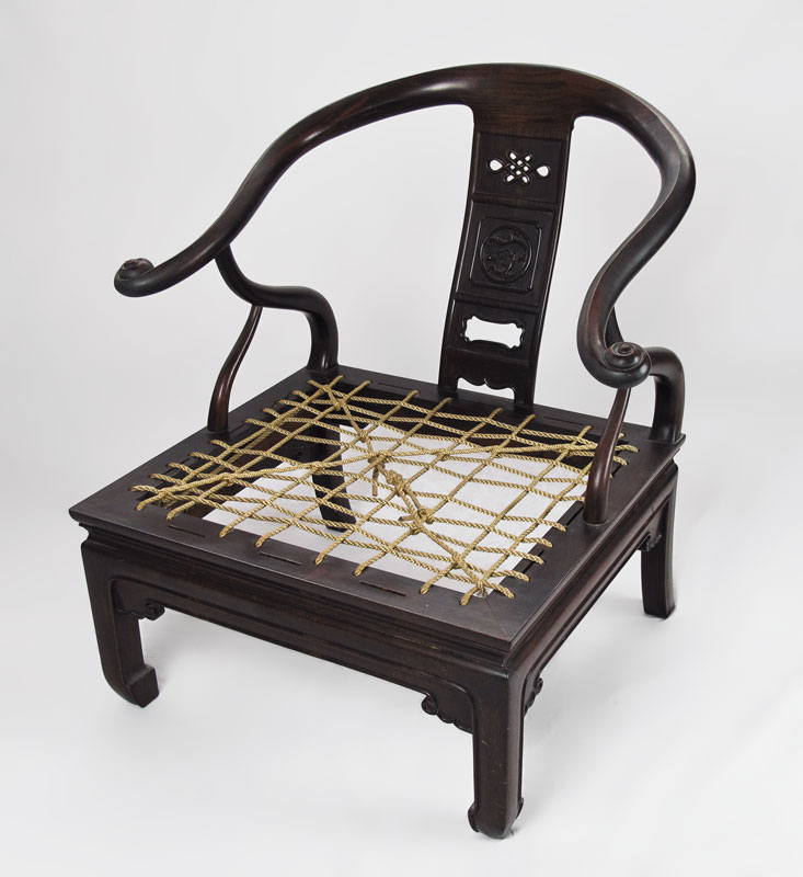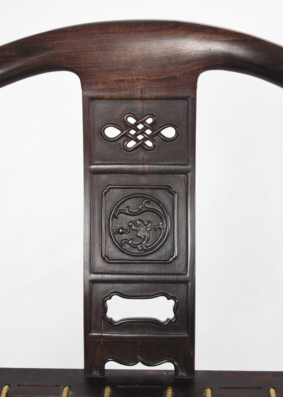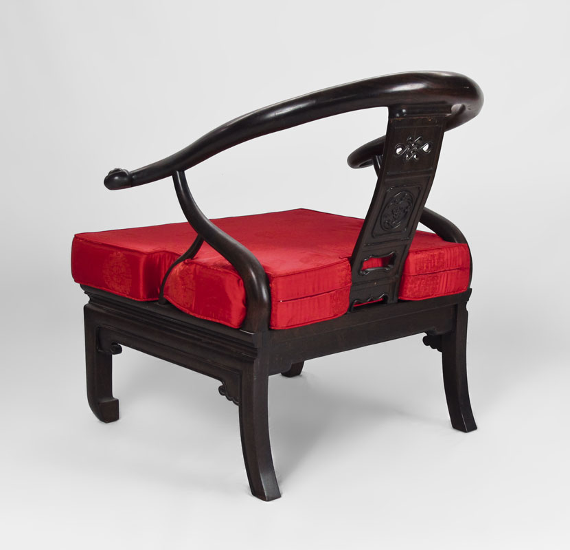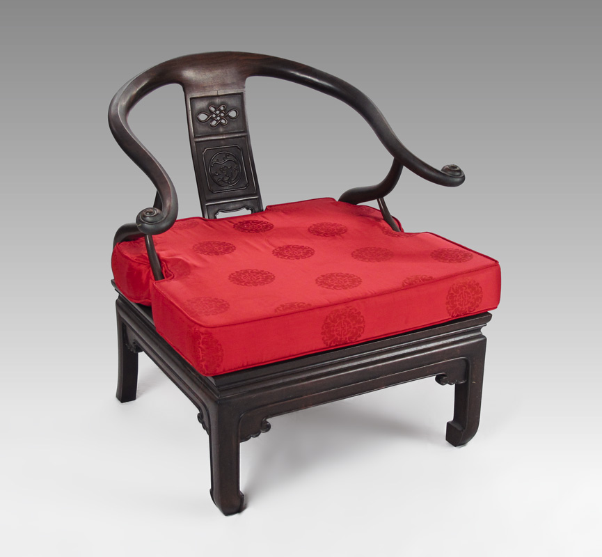 CHINESE HORSESHOE BACK CHAIR: Shaped top rail with carved back slat, carved and shaped skirt. Red oriental motif seat cushion. 30'' h. x 28 1/2'' x 27''.