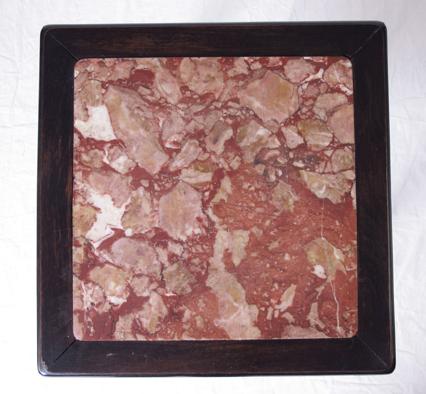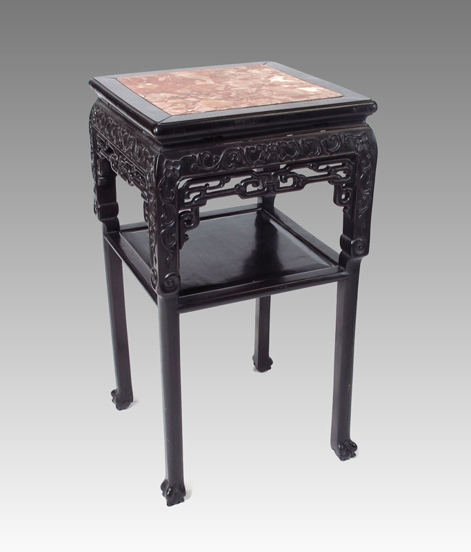 CHINESE TWO TIER MARBLE TOP FERN STAND: Square shaped with carved apron. Inset rouge marble top. Measure 32'' x 16.5'' x 16.5''.