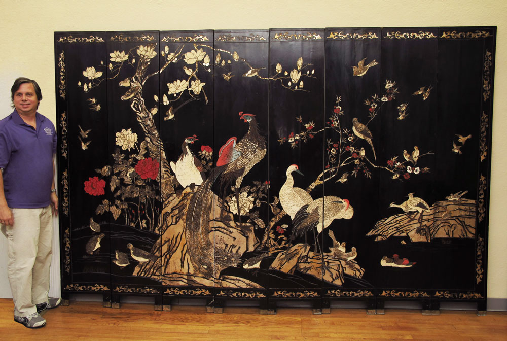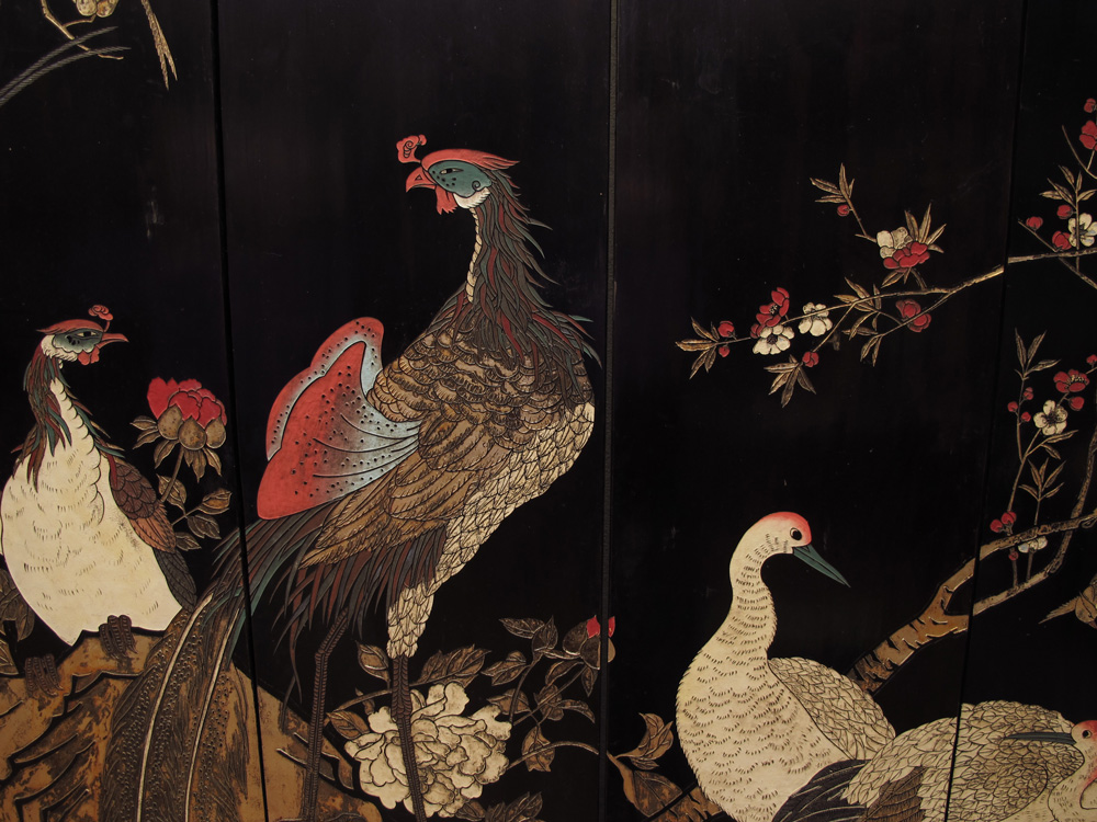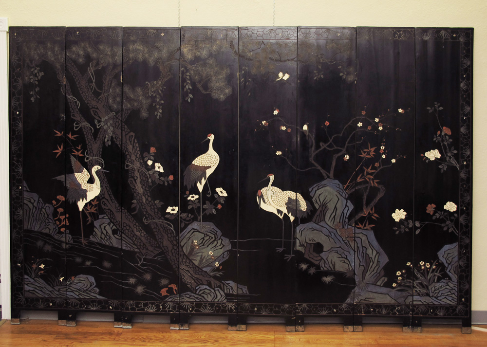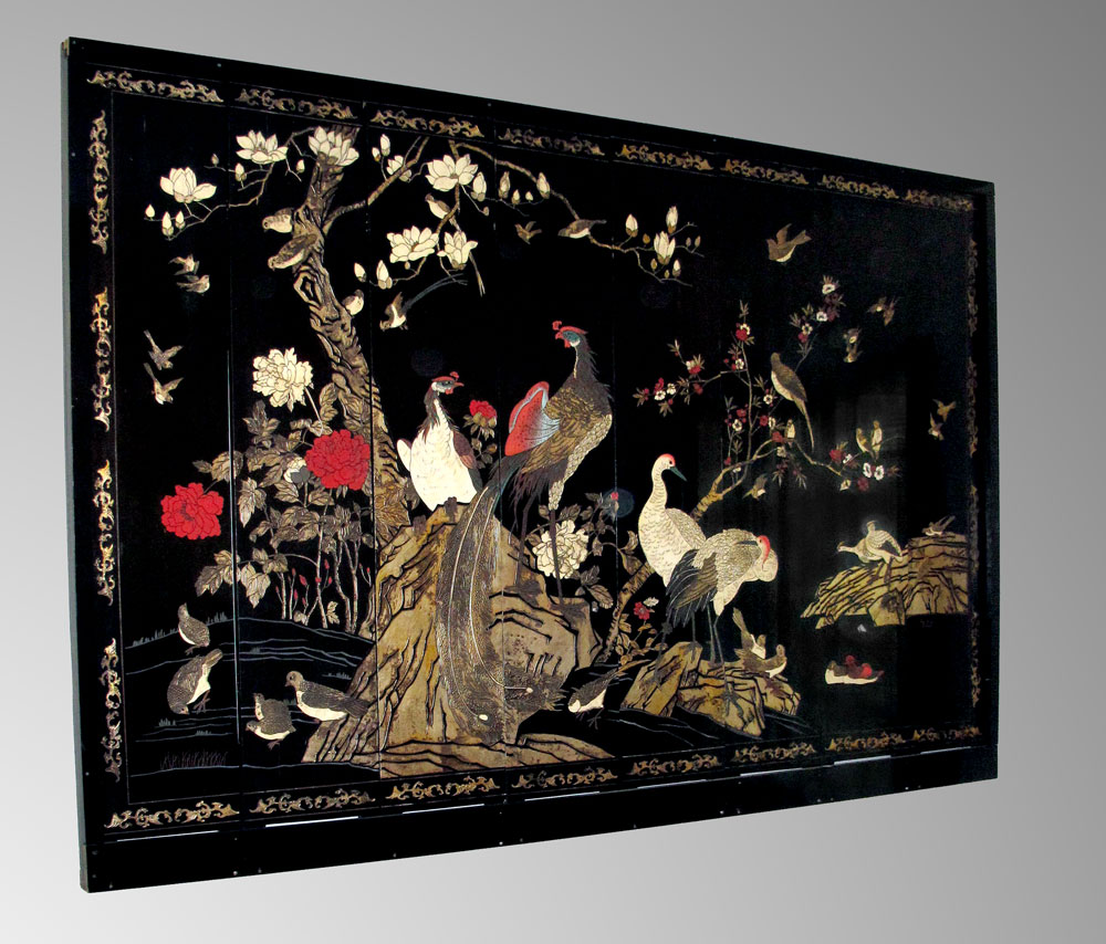 LARGE CHINESE 8 PANEL COROMANDEL SCREEN: Bold and metallic colors and graphics featuring birds and fauna, verso is a tamed image of birds. Approx. 7 ft tall x 10 ft. 10 inches wide. Each panel is approx. 16'' wide. There are no hinges. This screen was hanging on a wall with custom frame. The panels slide into place. The frame is available.