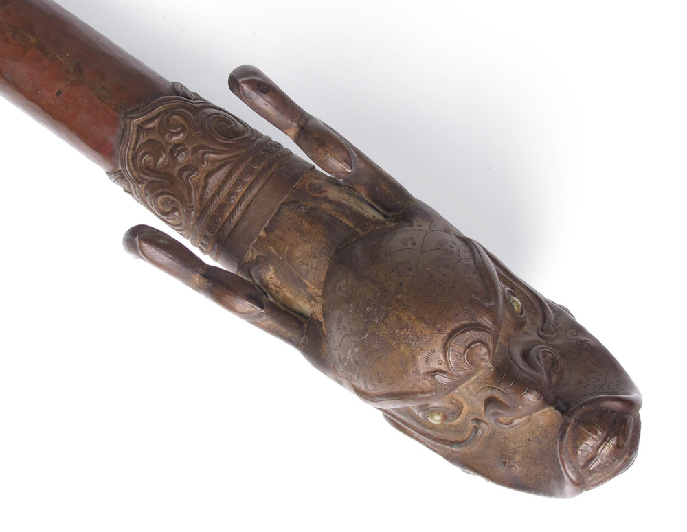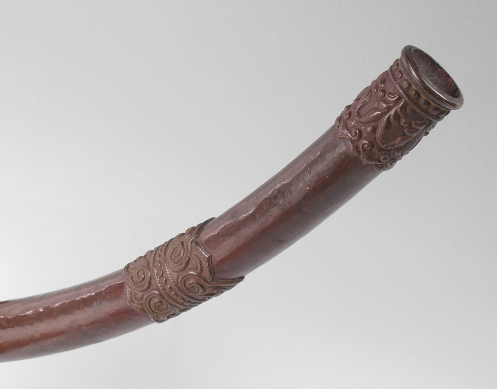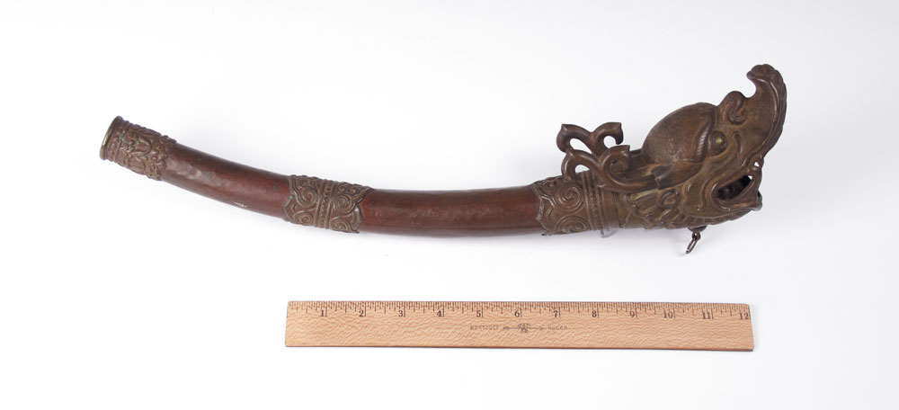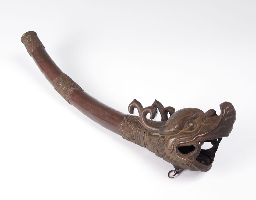 TIBETAN FIGURAL TEMPLE HORN: Figural serpent or dragon head, hand hammered copper body. Measures 18'' l. Age unknown.