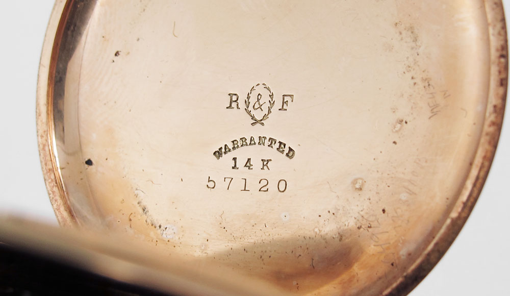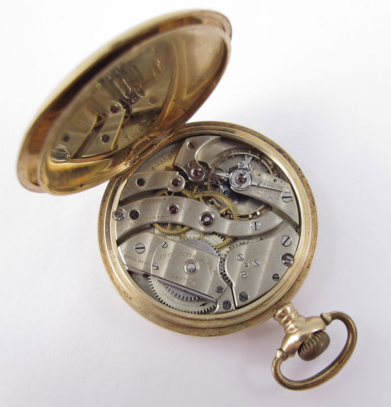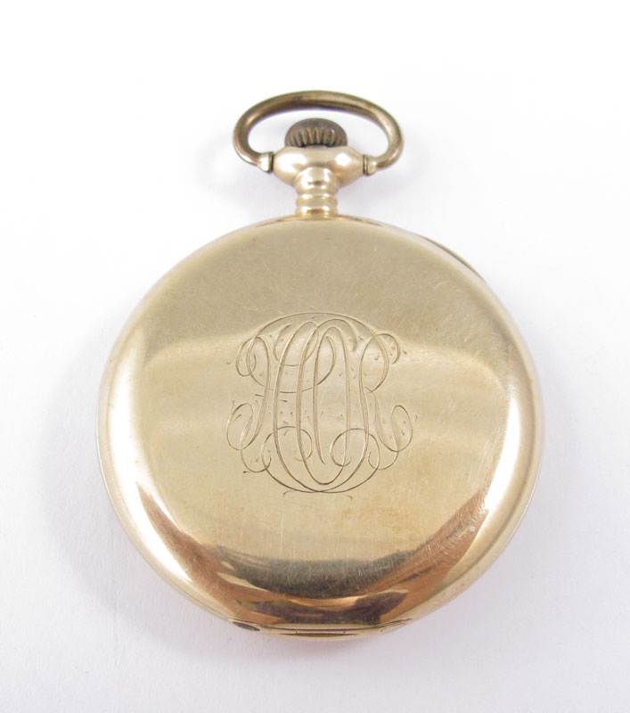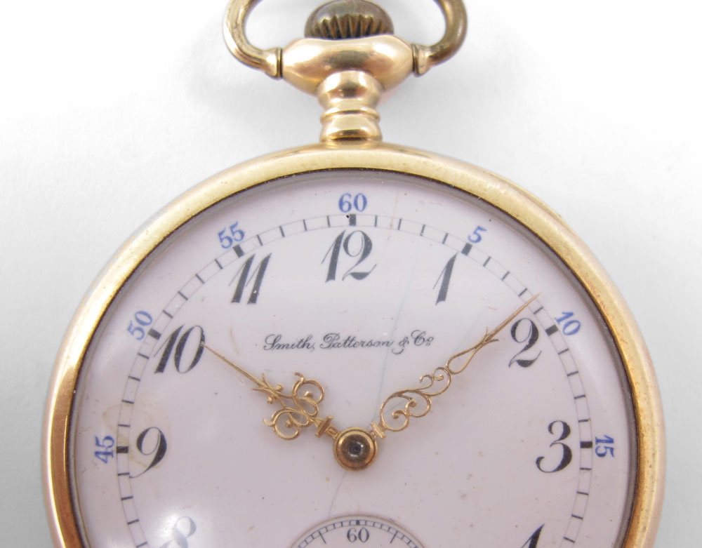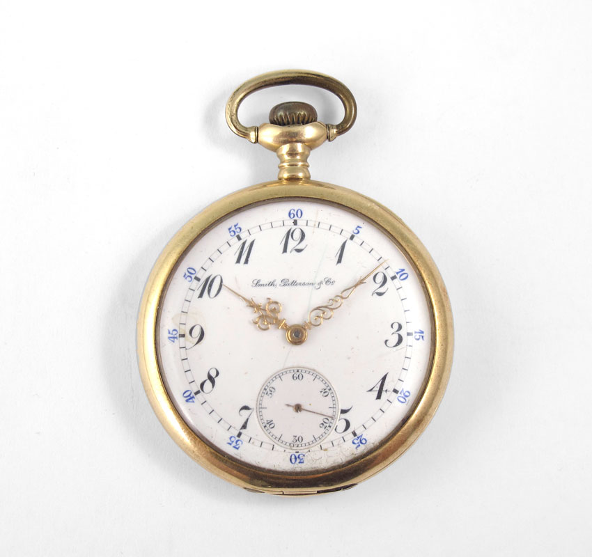 SMITH, PATTERSON & CO. 14K GOLD POCKET WATCH: Swiss made movement, #40852, made for Smith, Patterson & Co Boston, 14k yellow gold open face case, R&F wreath mark, #57120, monogram to back. Smith, Patterson & Company, Boston, Mass. was a fine quality jeweler comparable to Tiffany in New York. 1 3/4''