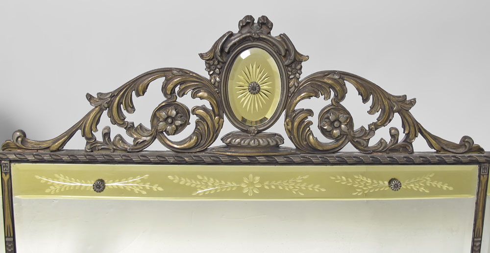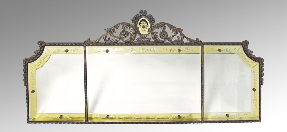 1920'S BUFFET MIRROR: Three parts with etched yellow mirror framing the looking glass. The carved wood frame with a bit of a gilt blush. Measures approx. 29'' tall x 60'' long.