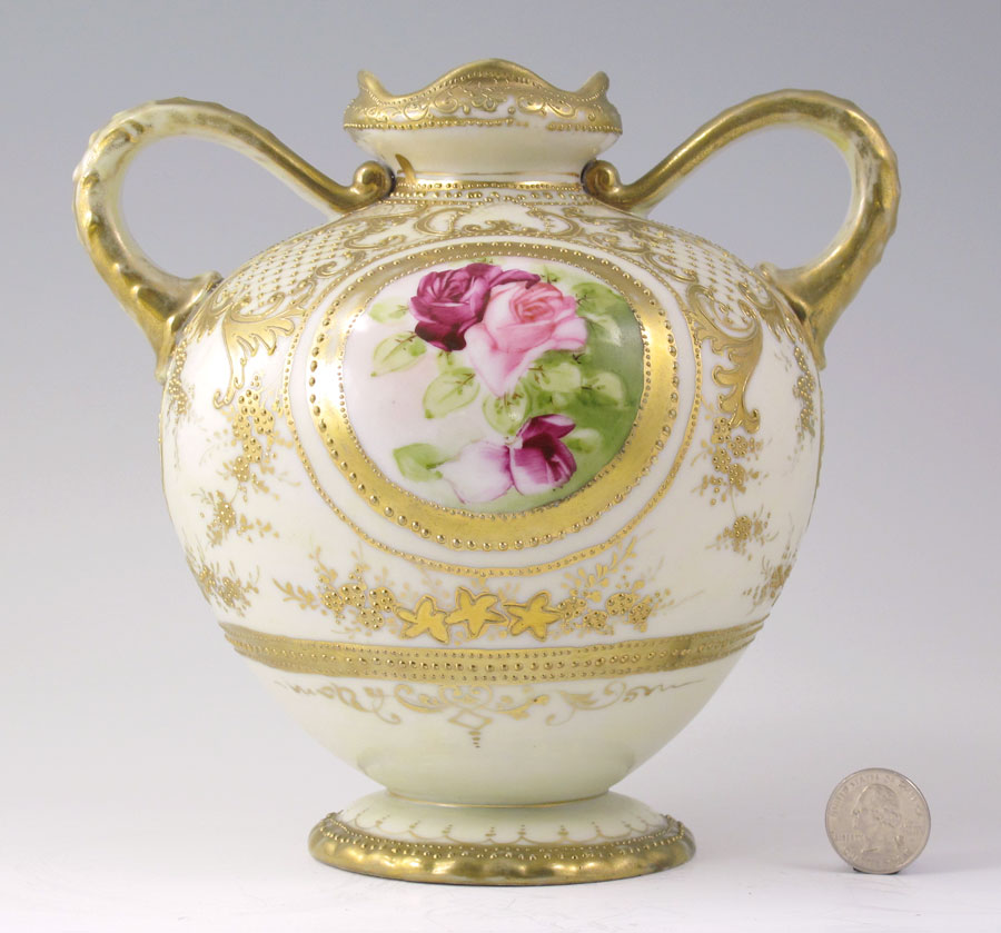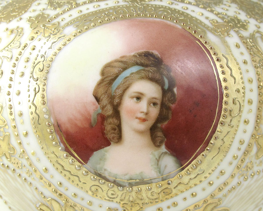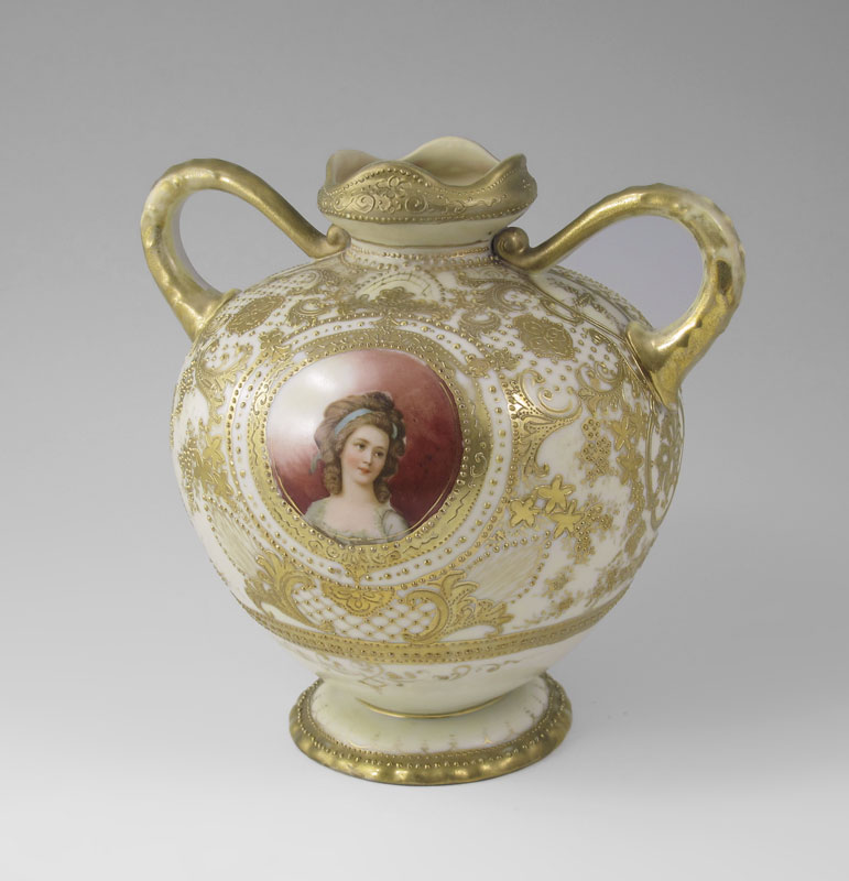 NIPPON COUNTESS ANNA POTOCKA PORTRAIT VASE: Double handle vase with portrait of Anna Potocka surrounded by gilt work and raised beading. Green maple leaf mark. Approx. 7 1/2'' tall x 7 1/2'' wide, handle to handle.