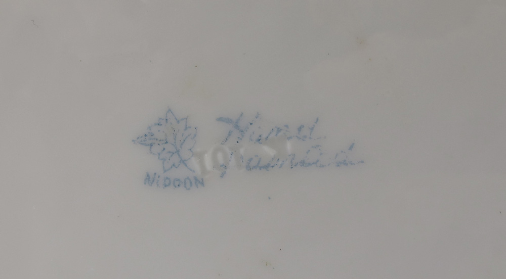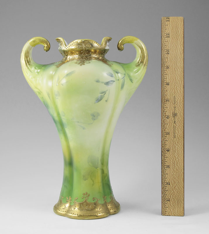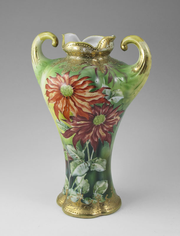 NIPPON HAND PAINTED PORCELAIN VASE: Bold coloration, parcel gilt. Double scroll handles. Approx. 10 1/2'' tall x 8'' at the widest. Blue maple leaf mark.
