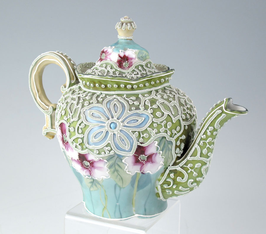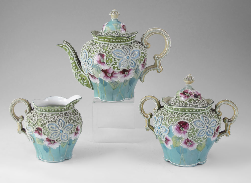 NIPPON MORIAGE TEAPOT, CREAMER AND SUGAR: Hand painted flower design surrounded in white moriage decoration. Teapot measures 6''.