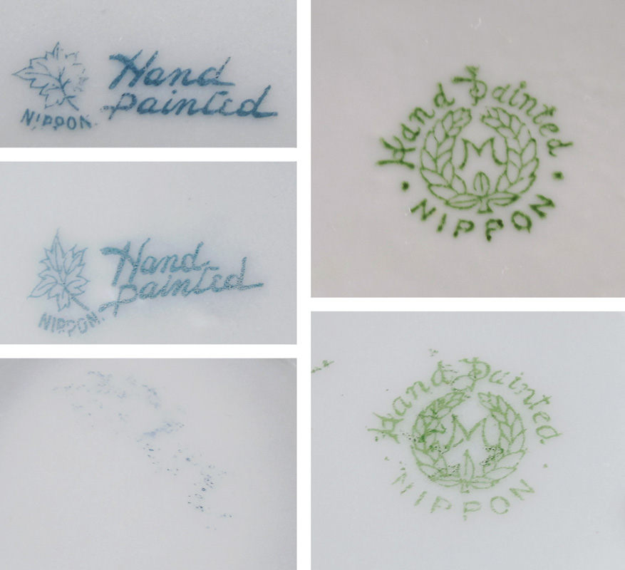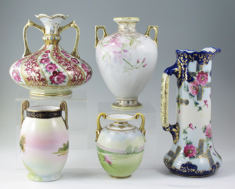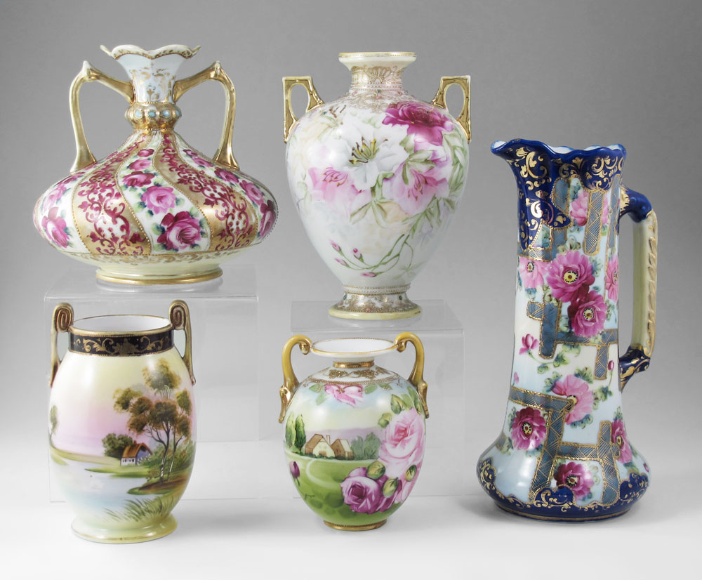 HAND PAINTED NIPPON PORCELAIN: 5 piece rose and landscape motif porcelain vases. All pieces are signed. The gold is worn. Largest cobalt and rose pitcher measures 10'' tall, the smallest vase, 5'' tall.