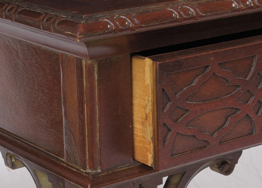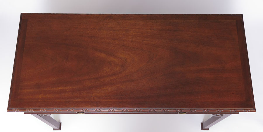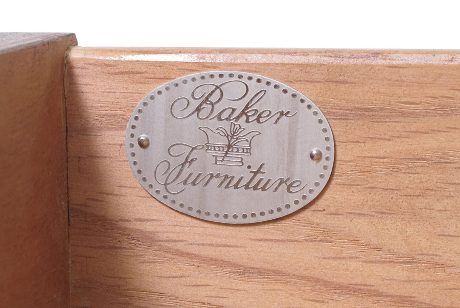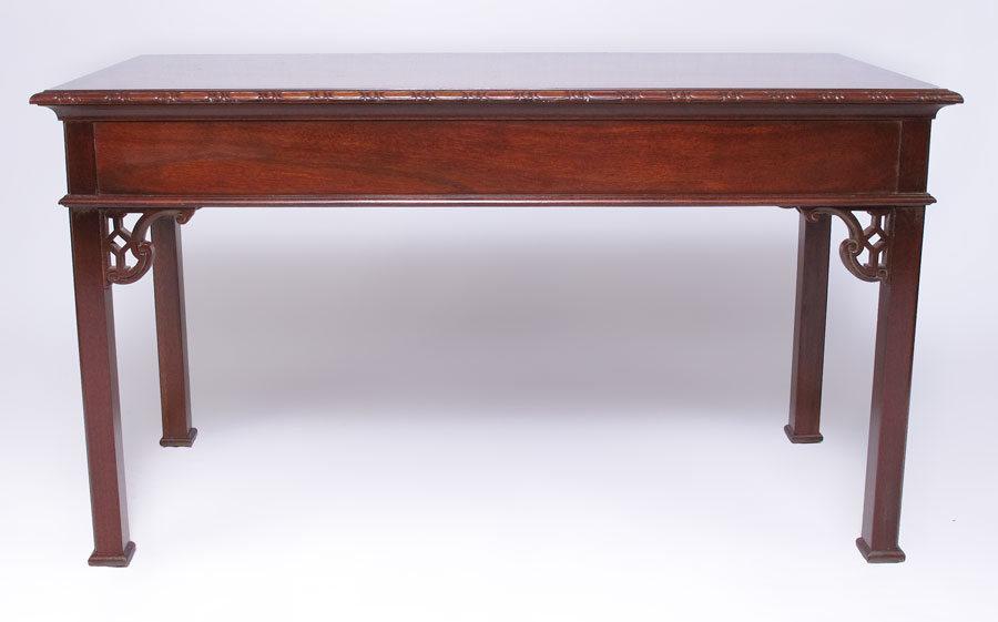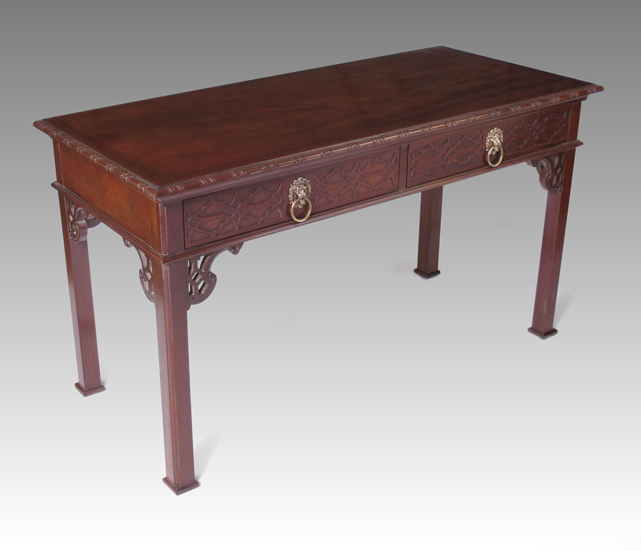 BAKER FURNITURE CONSOLE TABLE: Mahogany Chinese Chippendale style two drawer table. Metal name plate. Measures 27'' tall x 48'' x 22''.