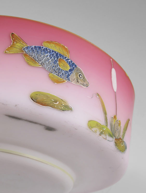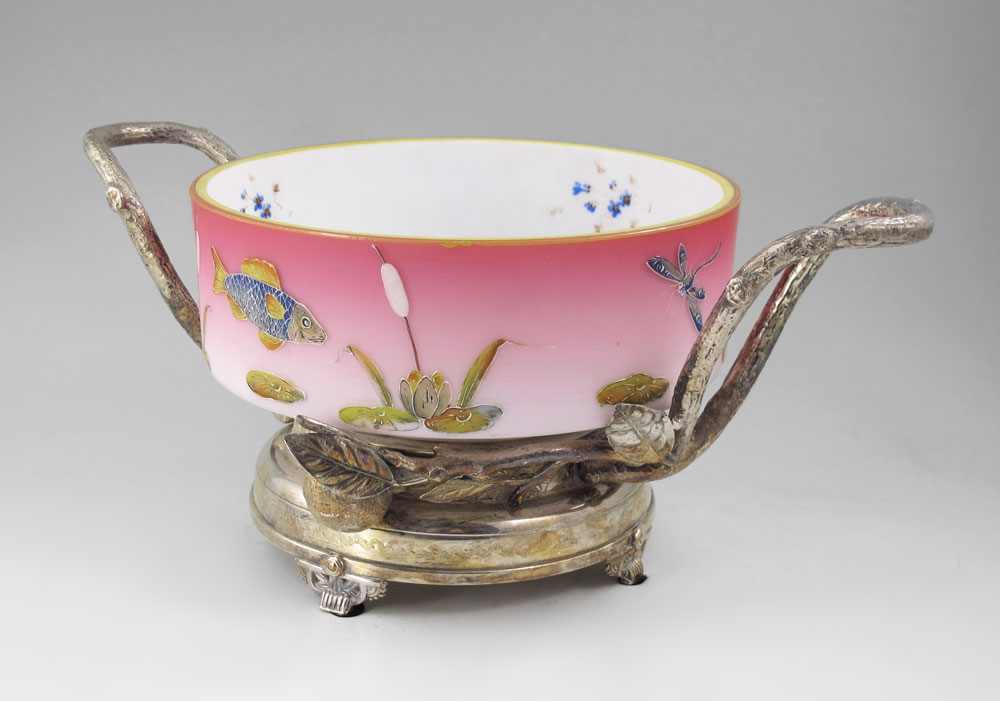 MT. WASHINGTON BURMESE BRIDE'S BOWL: Attribution. Glass bowl of pink to white with enameled pond motif decoration. Meriden Silverplate stand with branch and berry motif. Bowl 8 1/2'' x 4 3/4''h. The frame measures 15'' across.