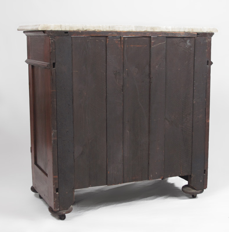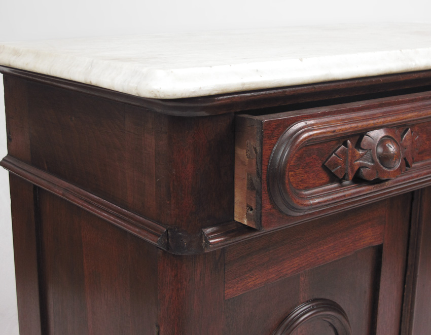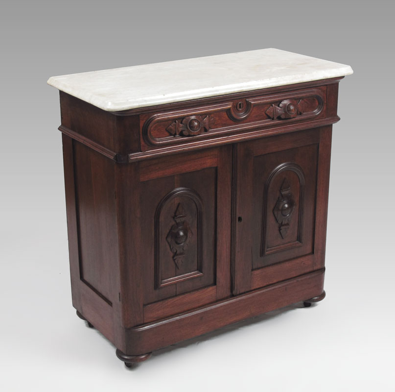 VICTORIAN MARBLE TOP COMMODE: Single drawer over two arch panel doors. Beveled marble top. 31 1/4'' h. x 31 1/2'' x 16''.