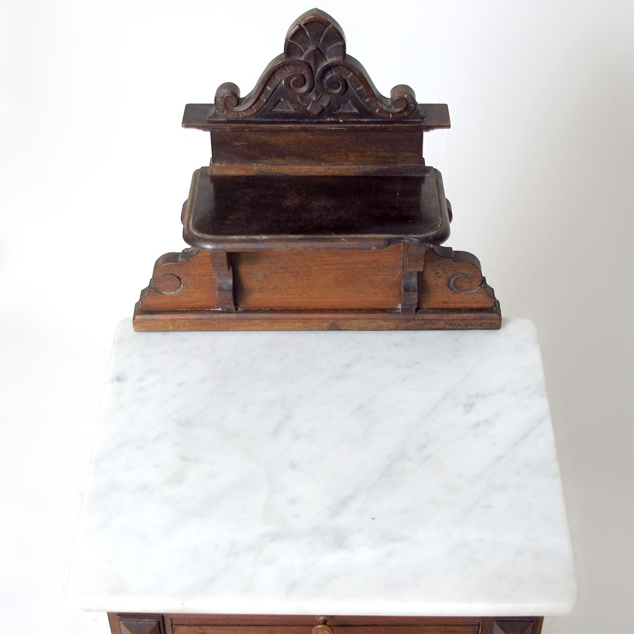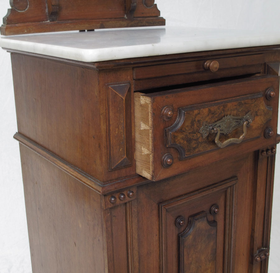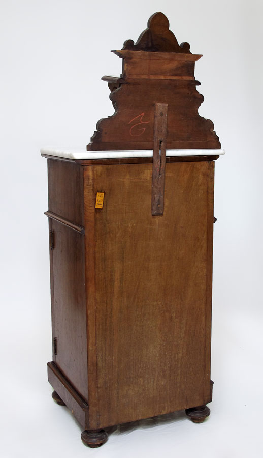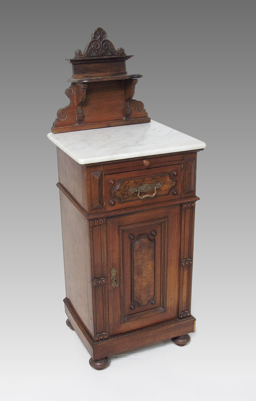VICTORIAN MARBLE TOP STAND: Carved crest with shelf over marble top. Sliding work surface over drawer over door with burl veneer accents. Bun feet. 46'' h. x 17 1/4'' x 14 1/4''.