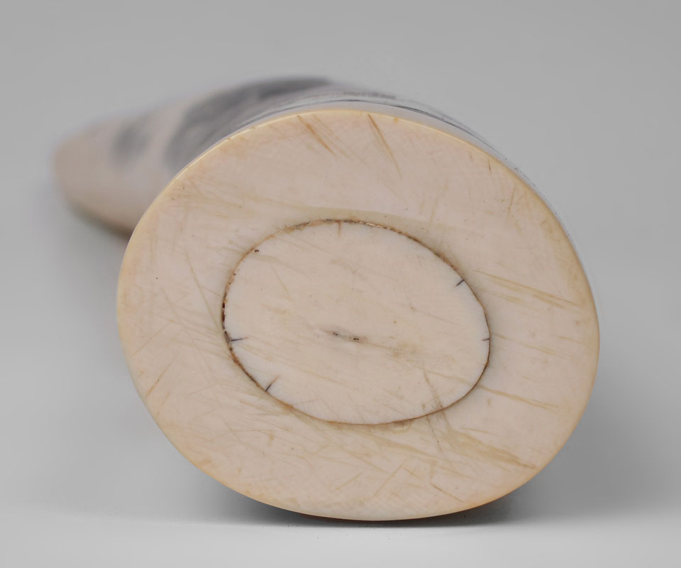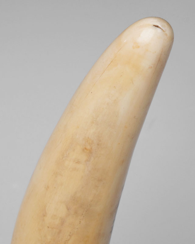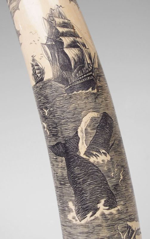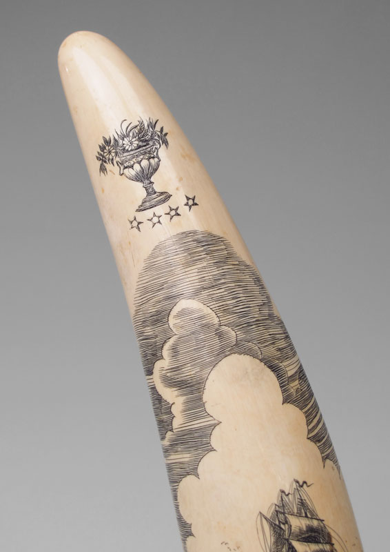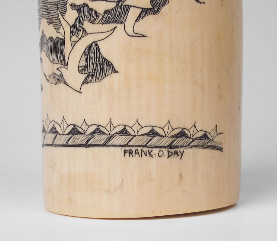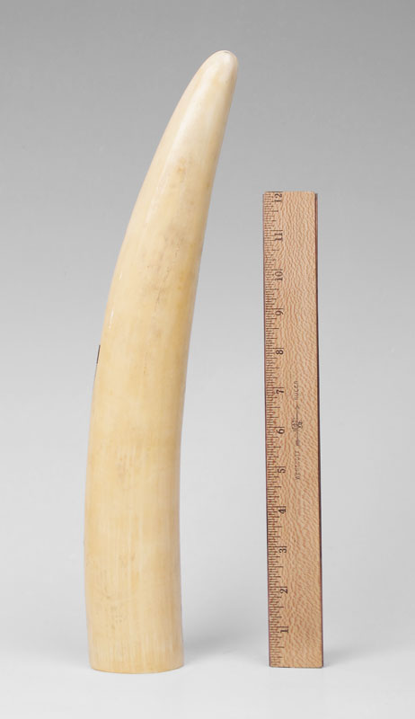 LARGE FRANK O. DAY SCRIMSHAW WALRUS TUSK: Scrimshaw with elaborate scene featured 2 clipper ships, sperm whales, seagulls and lighthouse. All below a urn with flowers and 4 stars. Signed Frank O. Day. Measures 16'' l.