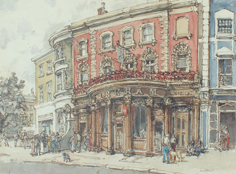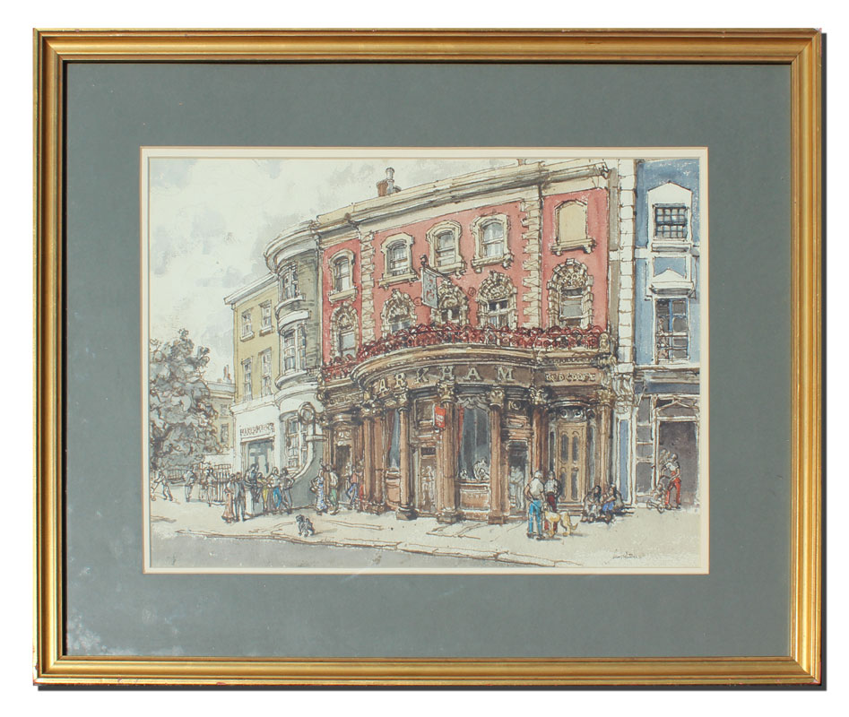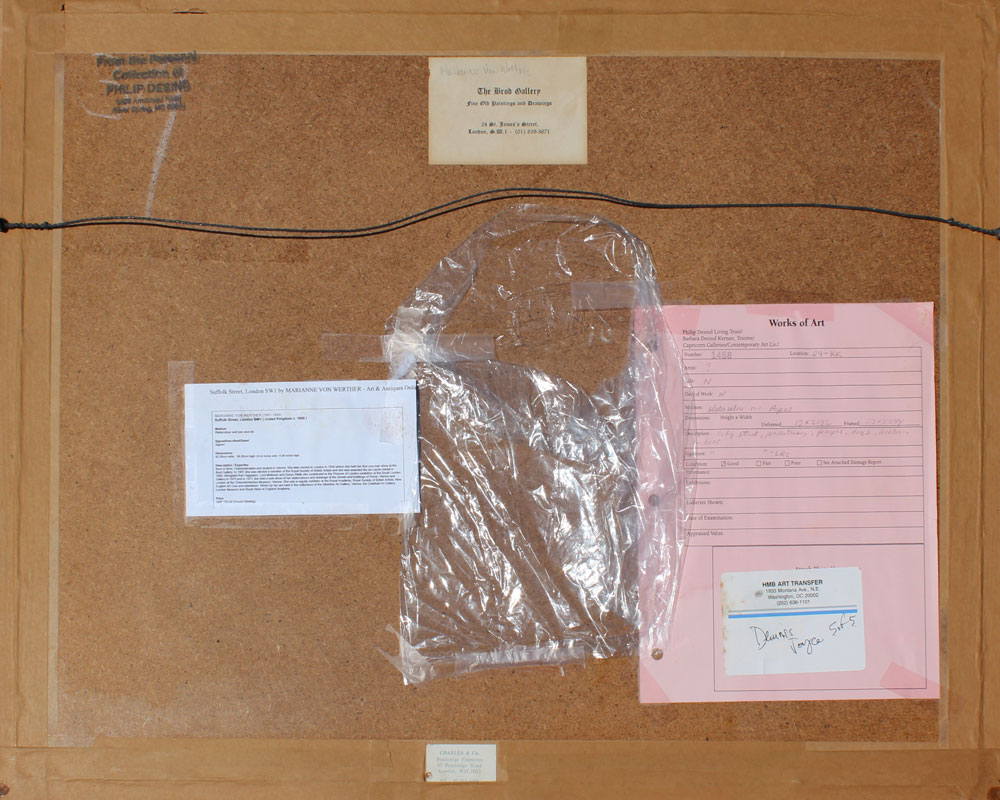Von WERTHER, Marianne, (British, 1901-1984): ''Scene is Swinging London'', London street scene with Figures, Watercolor, sight size 14 1/4'' x 20 1/4'', signed lower right, gilded frame with minor wear, 23'' x 29''. The Brod Gallery label affixed verso.