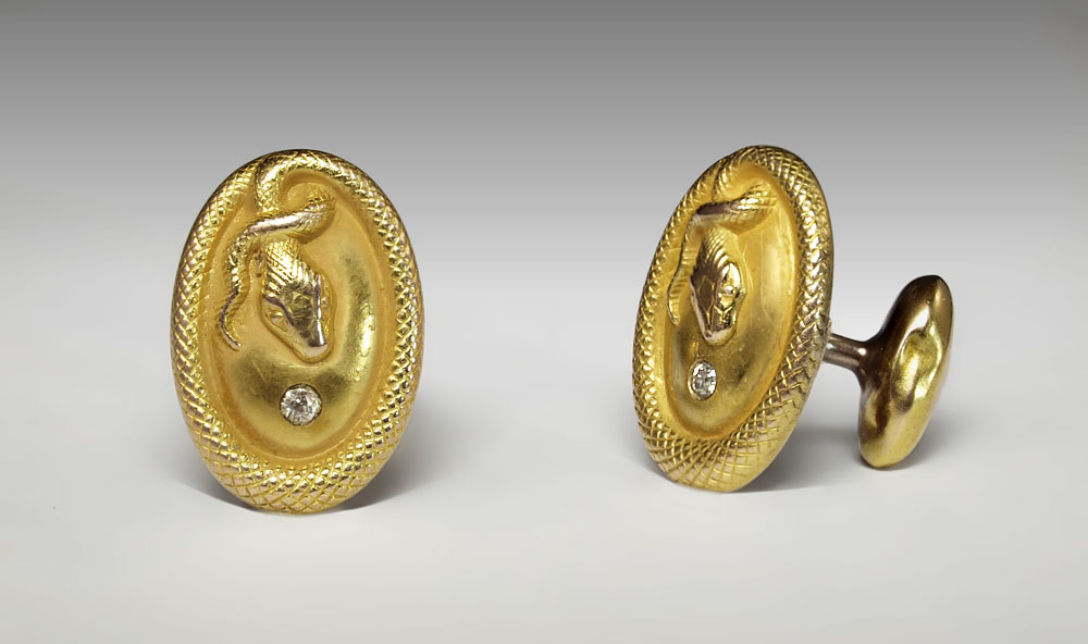 14K ART DECO SNAKE DESIGN CUFFLINKS: 14K yellow gold cufflinks with snake motif. Two old European round cut diamonds. Weight: .12 Ct. Approx. VS in clarity and H-I in color. The diamonds are deep set. One cufflink has been repaired. The diamonds are deep set. Weight: 6.7 grams.