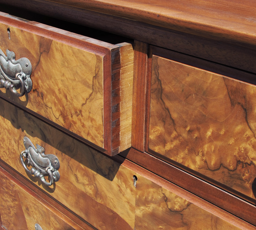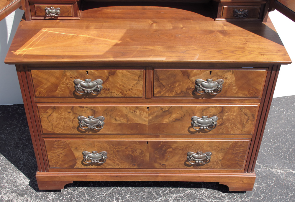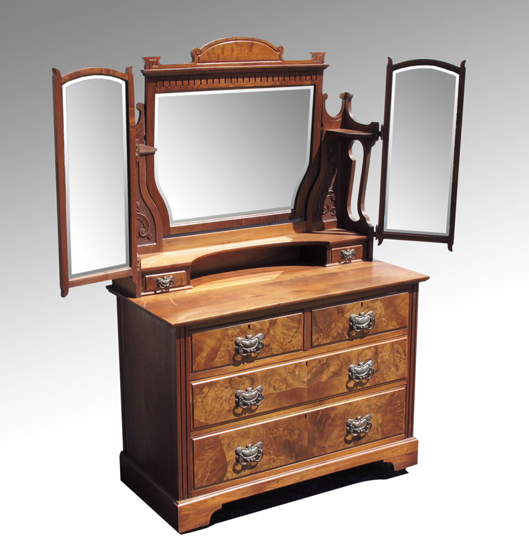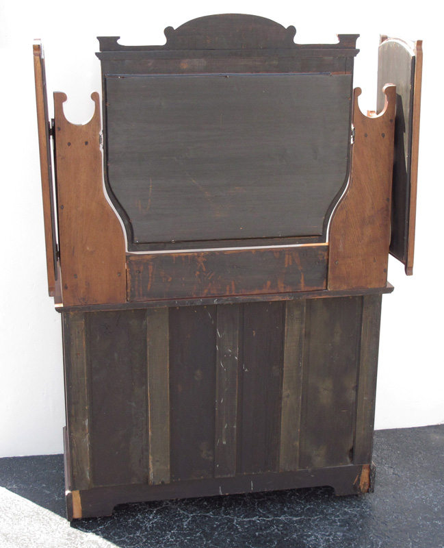 ART NOUVEAU ERA GULL WING DRESSER: Carved and shaped crest over central beveled glass mirror surmounted by articulated gull wing mirrors. 2 drawers under shelf under mirror. Base with 2 half drawers over 2 full length drawers with burl veneer. 64'' h. x 42'' x 19 3/4''.