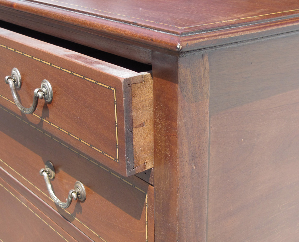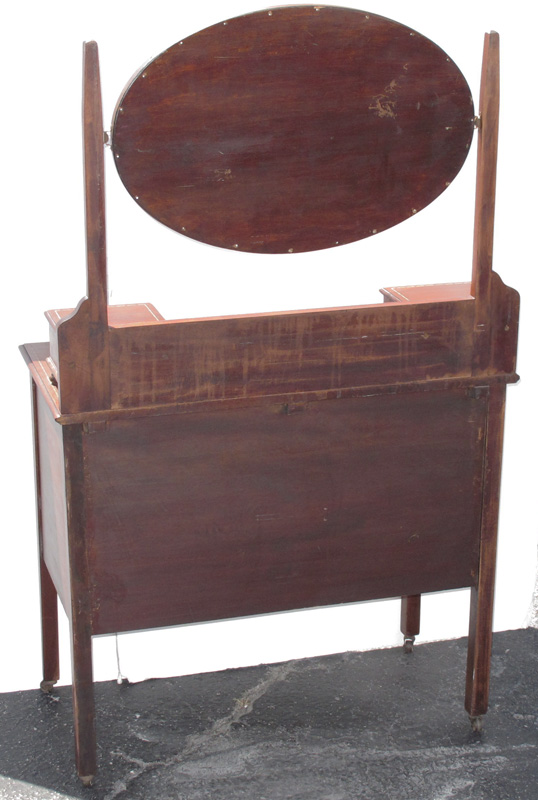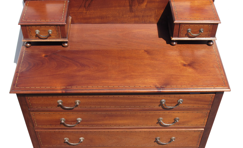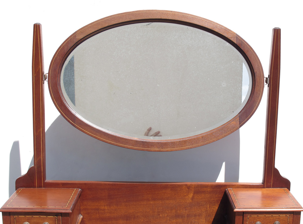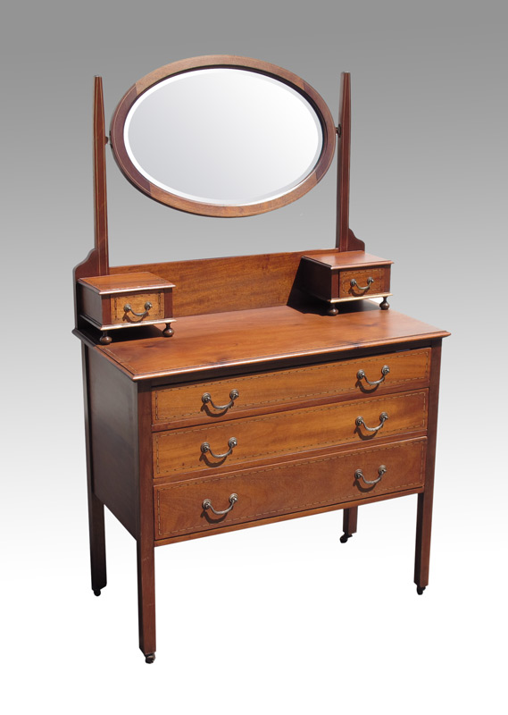 WALNUT STRING INLAY DRESSER: Oval beveled glass mirror, 2 single drawer glove boxes. 3 graduated full length drawers on straight legs with castors. 56 1/4'' h. x 35 1/2'' x 18 1/4''.