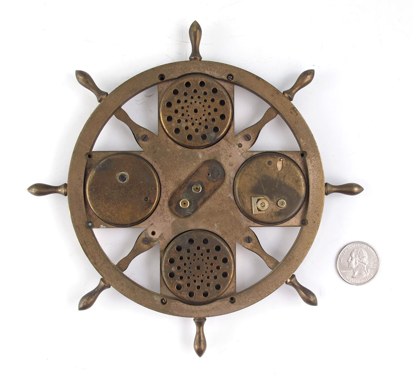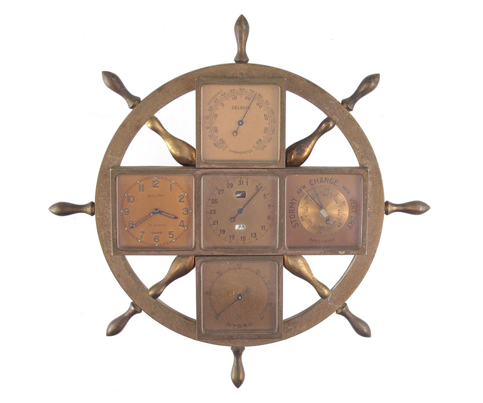 MATHEY-TISSOT SHIPS WHEEL CLOCK / WEATHER STATION: A unique timepiece by Mathey-Tissot featuring 5 dials with a clock, thermometer, calendar, barometer, and hydrometer. Affixed to a brass ships wheel frame. Reputedly made for Abercrombie & Fitch however similar timepiece without the wheel were made for Mark Cross. 6 7/8'' dia.