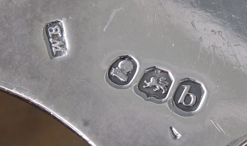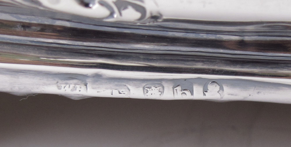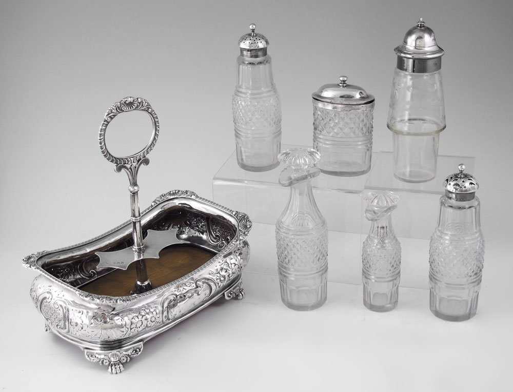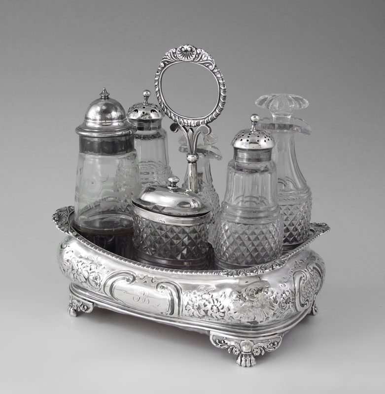 1817 ENGLISH STERLING SILVER CRUET STAND: Repousse silver cruet stand with handle marked with 1817 London hallmarks, WB maker, could be attributed to several different makers. Monogrammed repousse stand with floral motif, on 4 feet, wood bottom. Sold with 5 cut glass containers, 3 silver mounted with matching hallmarks, and one other non matching silverplate mounted bottle. Overall 8 3/8'' h. x 8'' x 5''
