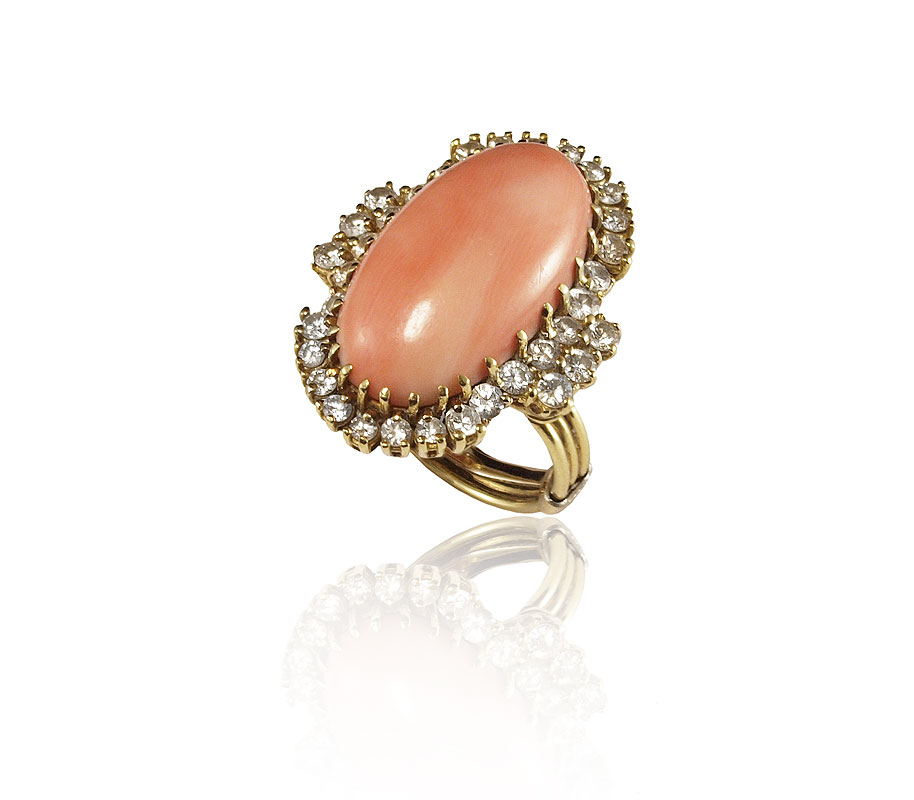 18K CORAL AND DIAMOND RING: 18K yellow gold ring centers one 22.00 x 12.00 mm oval cabochon cut piece of red coral with some pink mottling. The coral is framed by 38 round brilliant cut diamonds totaling approx. 1.50 Ct. Approx. Rated VS in clarity and H-I in color. The coral and diamonds are prong set. Weight: 11.8 grams. Size: 5.5