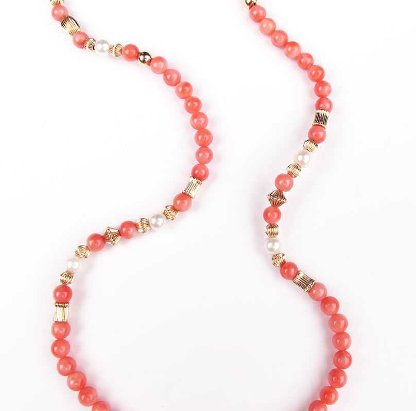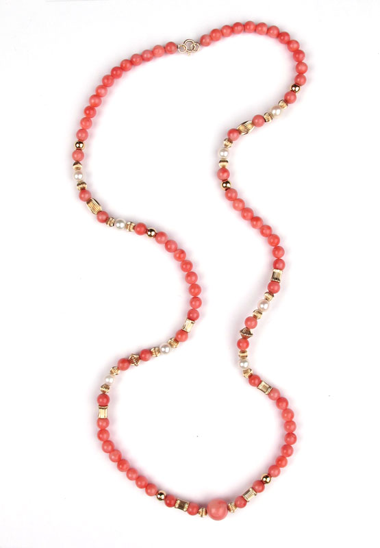 14K CORAL & PEARL NECKLACE: Coral beads and cultured pearls measure 5.50 mm. 14K fluted ball, barrel and oblong spacers. 14K spring ring clasp. Length: 24''