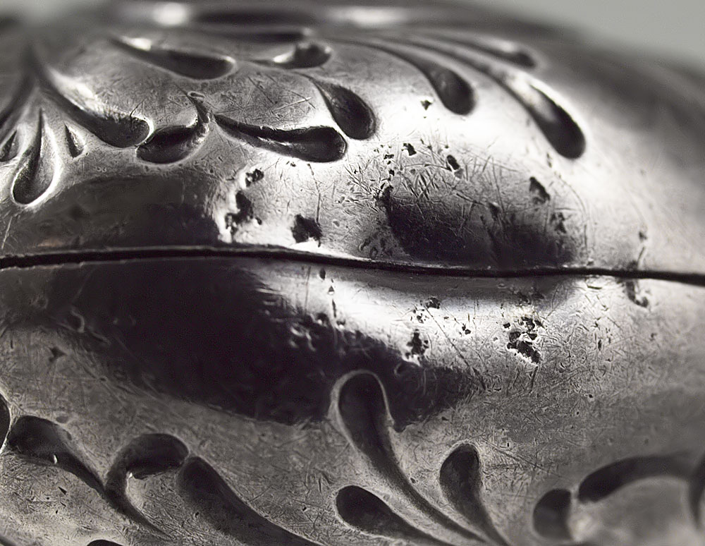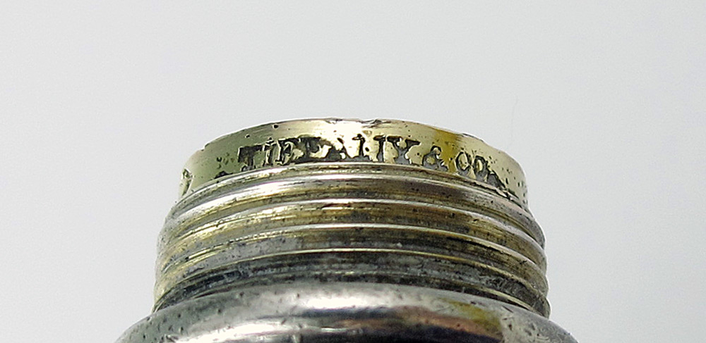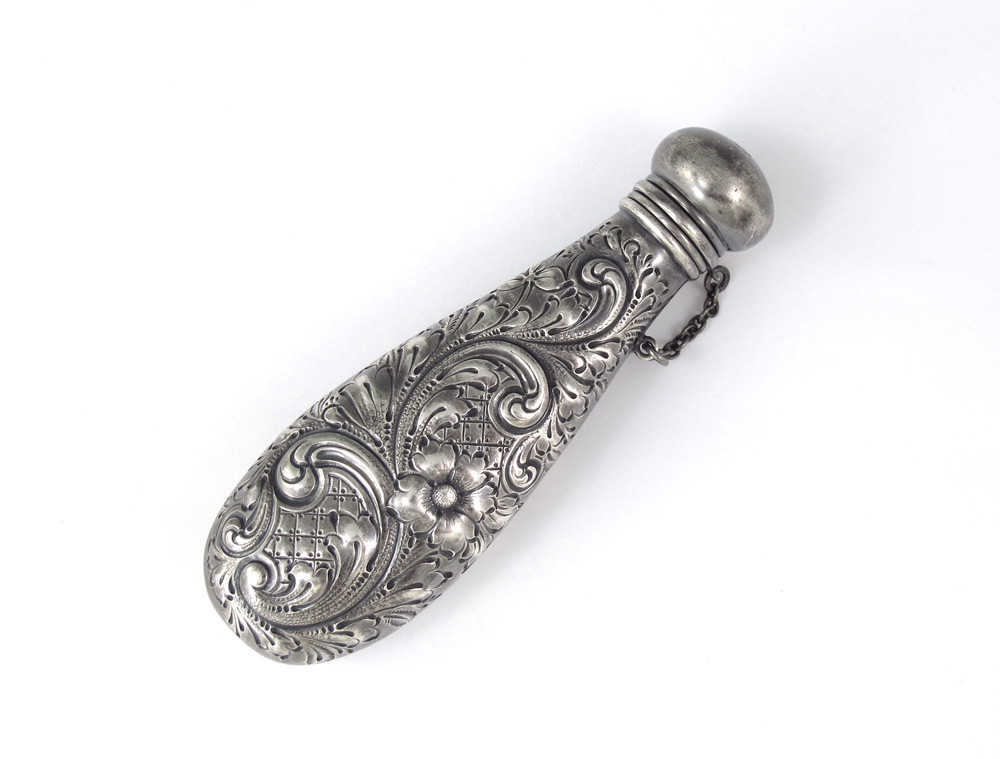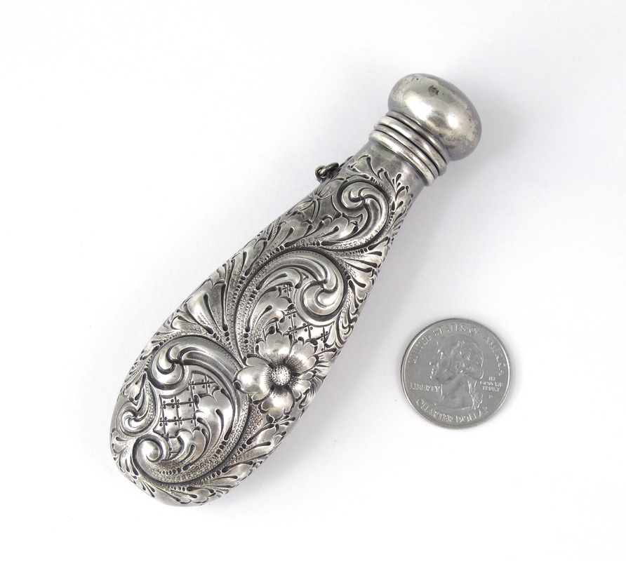 DIMINUTIVE TIFFANY & CO. EMBOSSED FLASK: Dominick & Haff for Tiffany, embossed foliate scroll and floral motifs, monogrammed on screw top lid NLB. Marked on lip with Dominick & Haff hallmarks, Tiffany & Co. Sterling. 4 1/4'' l. Approx. 1.7 troy oz.