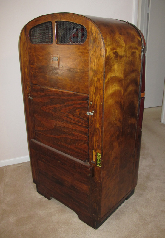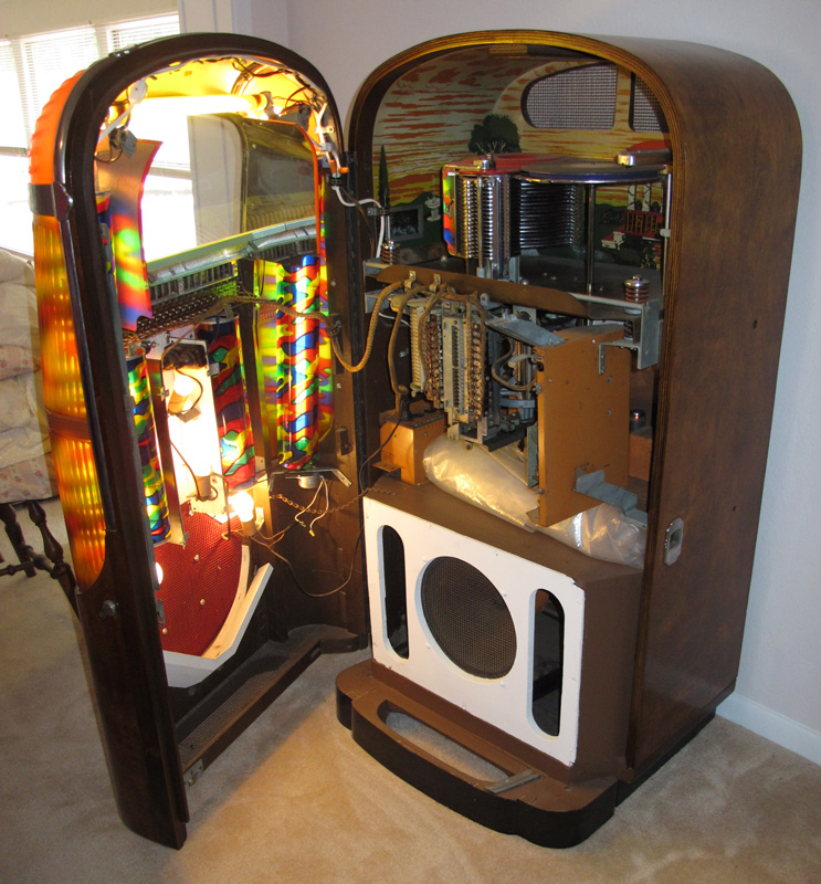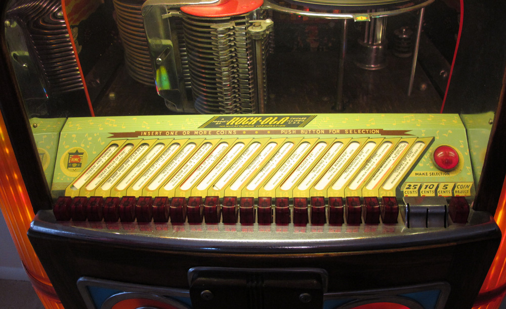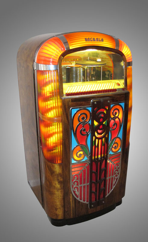MODEL 1422 ROCK-OLA JUKEBOX: Circa 1946-7, plays 20 selection, 78 rpm records. 4 rotating color wheels and wood grill. Presentation finish. Refurbished but appears to be mostly original. Serial number 99116. Currently set up for free play, we have not tested the coin mechanism. Sold with records inside. Measures 57'' h. x 30'' x 26''.