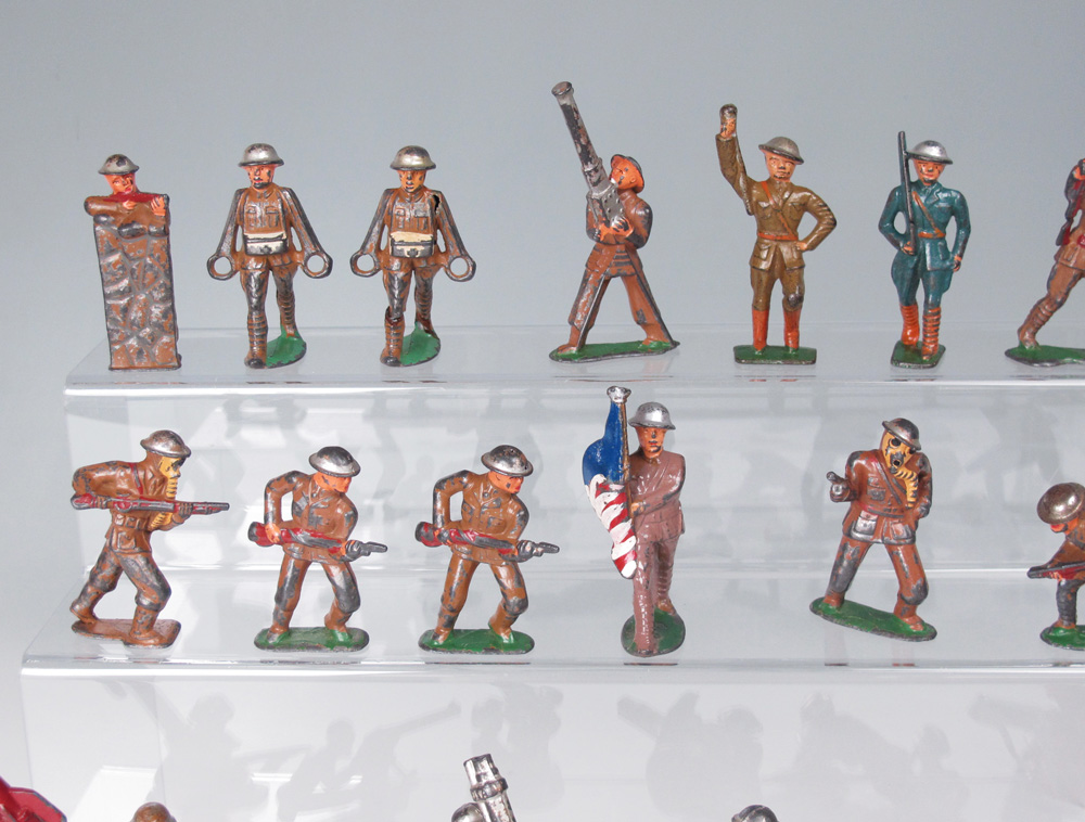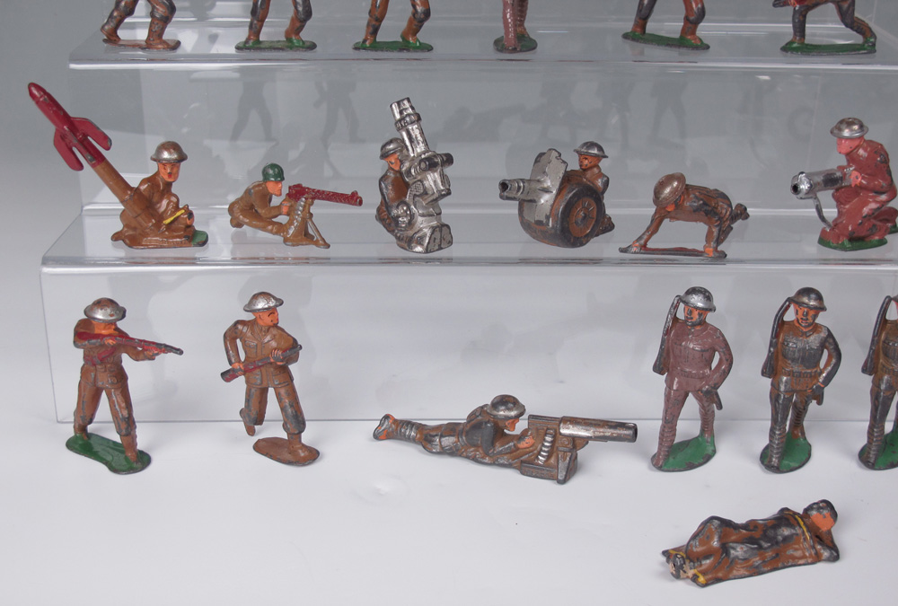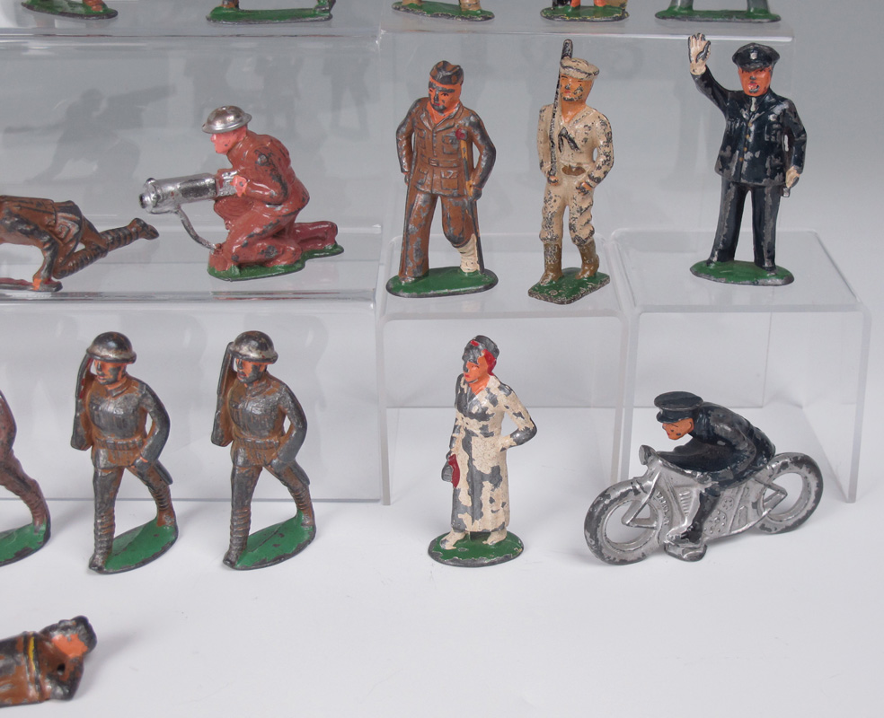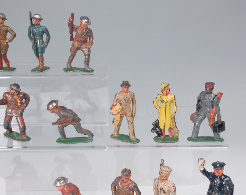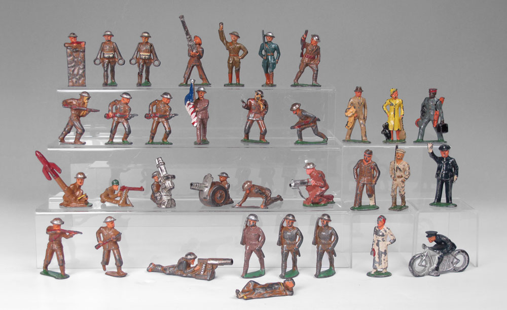 COLLECTION OF SOFT METAL ARMY FIGURINES: Circa 1940's, from the original owner, a mixture of Barclays and Manoil, approx. 27 Army, 1 Navy, 2 policemen and 3 other figures.