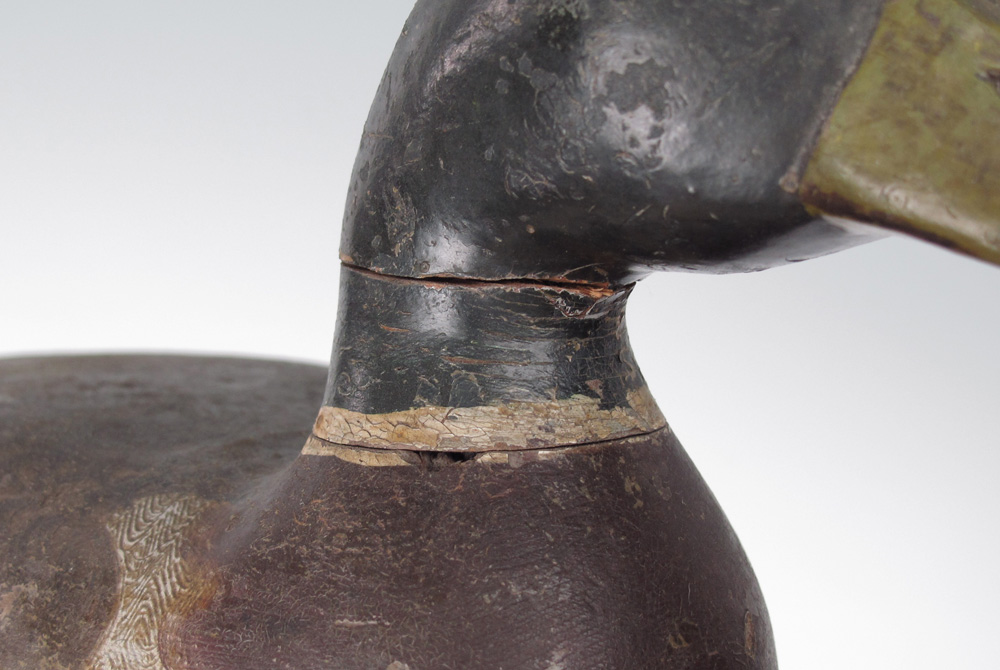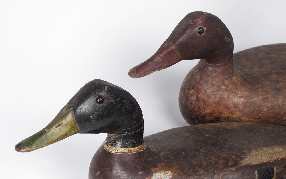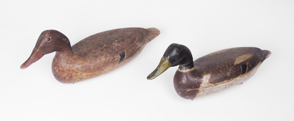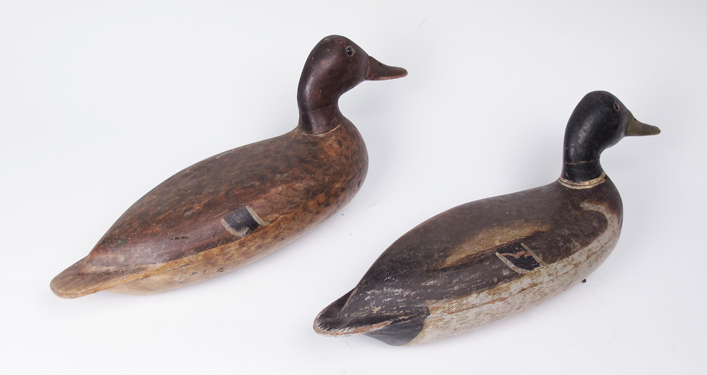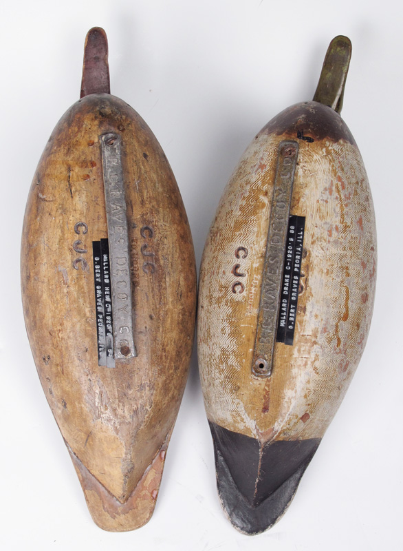 IMPORTANT PAIR OF G. BERT GRAVES MALLARD DUCK DECOYS: Circa 1920's Peoria, Illinois, original lead weights marked G. B. Graves Decoy Co.. Working decoys and show signs of use and wear, drake has crack to neck. Both exhibit paint loss. Bouble CJC brand and impressed Ed. Moore stamp. . Drake measures 7 1/2'' h. x 17 1/2'' x 5 3/4''. Hen 7 1/4'' h. x 17'' x 5 1/2''.