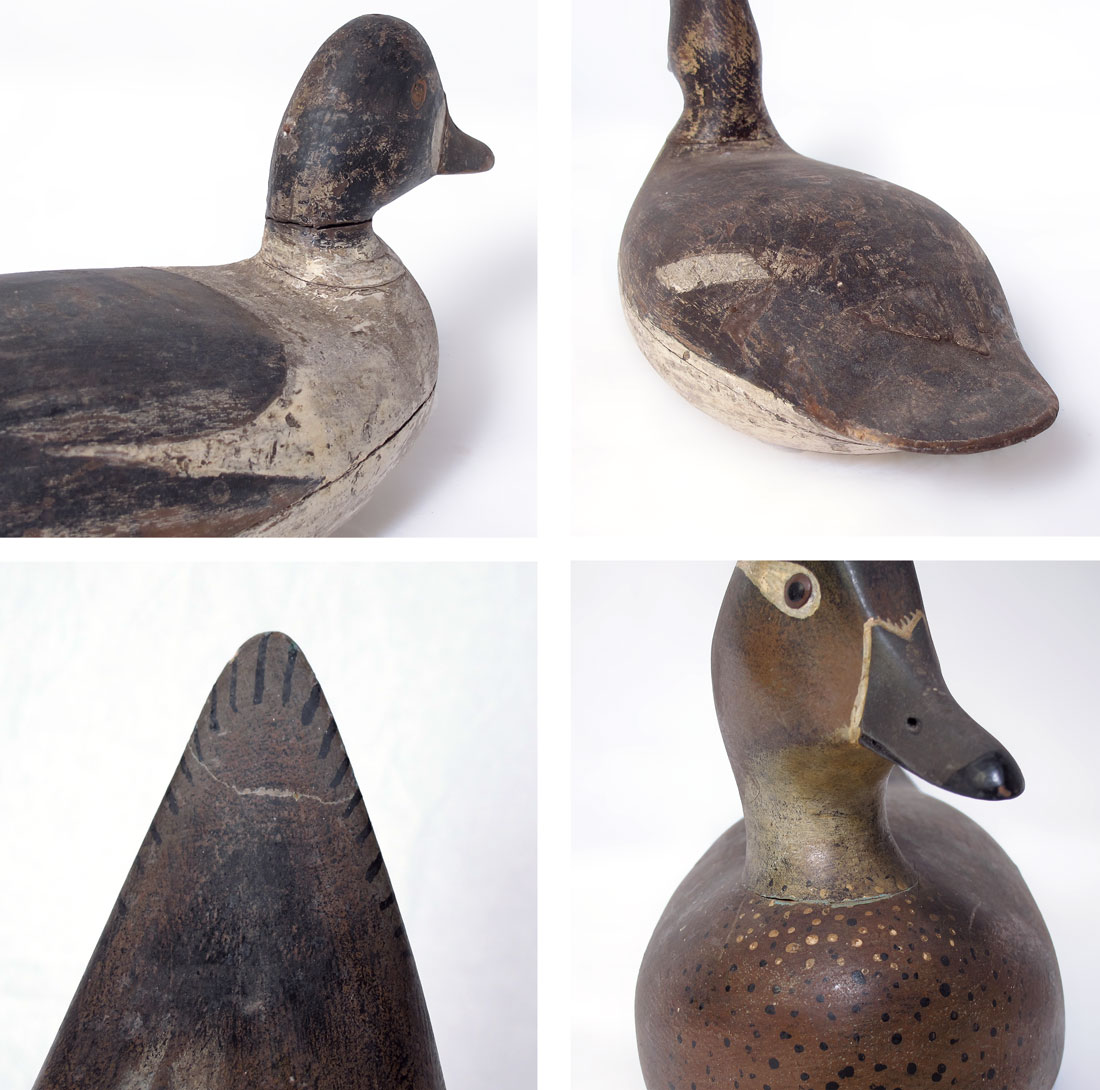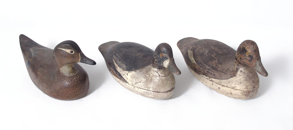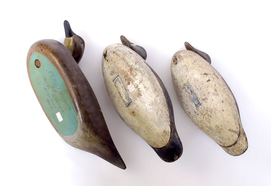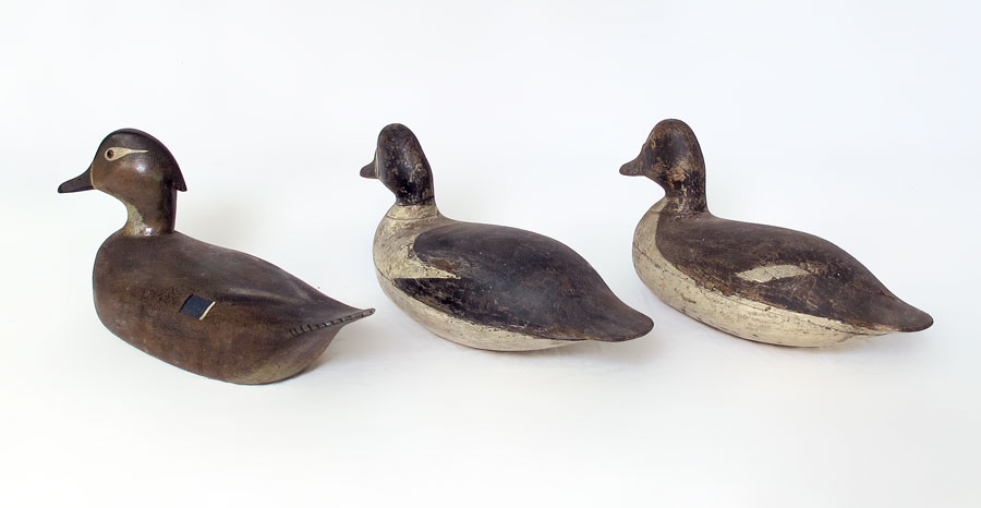 3 VINTAGE DUCK DECOYS: To include 2 goldeneyes, stamped 0000 on top, no other markings. Sold with a Menin Brabaw wood duck hen, signed and dated 1964. Wood duck measures 6 1/2'' h. x 14 1/2'' x 4 3/4'', goldeneyes 6 1/2'' x 14'' x 5 1/4''.