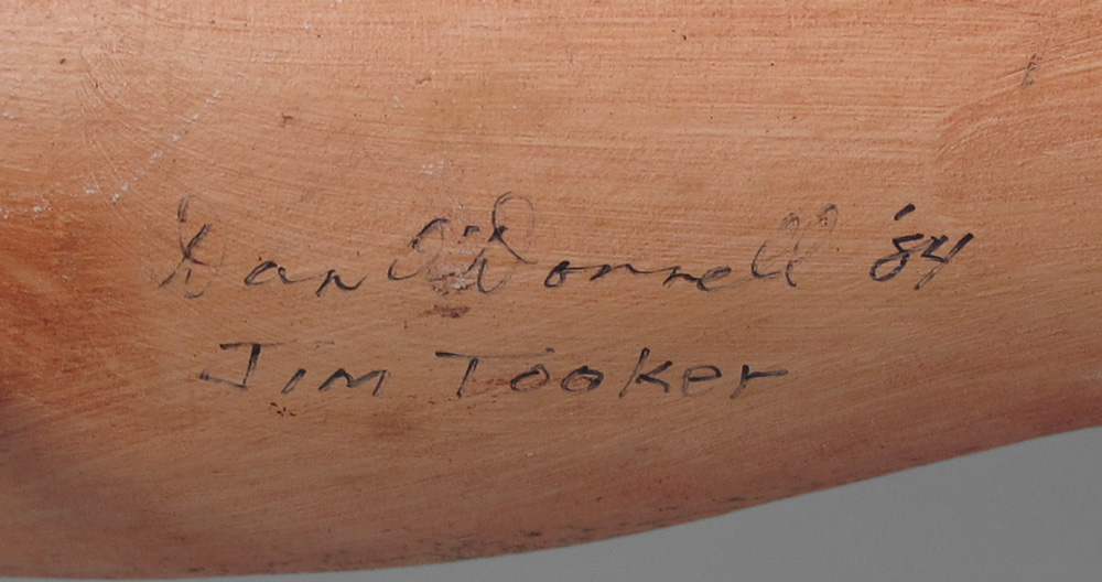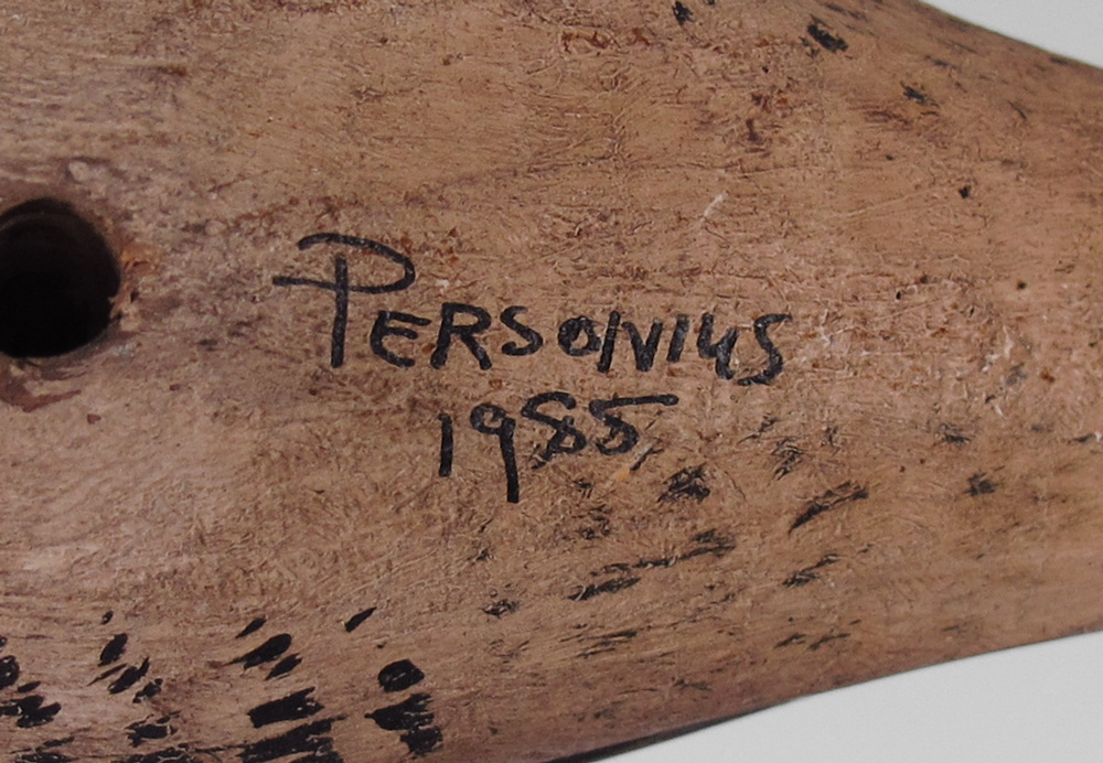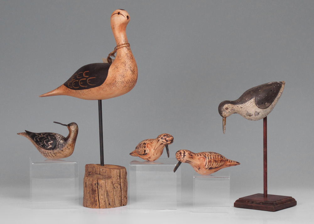 COLLECTION OF 5 SHORE BIRD DECOYS: To include 1) Mark Personius 1985, 4'' h. x 6''. 2) Unsigned vintage shorebird with flaking paint. Measures 3 3/4'' h. x 7 1/2''. 3) 3 Dan O'Donnell & Jim Tucker '84 decorative shorebirds, largest missing beak. Sold with 2 stands.