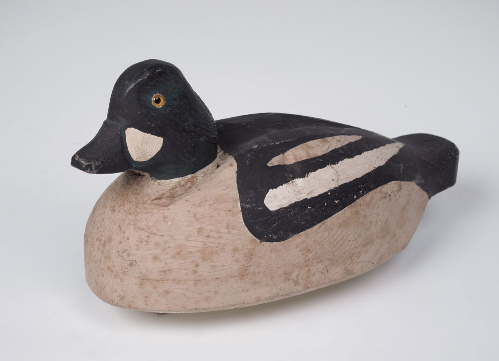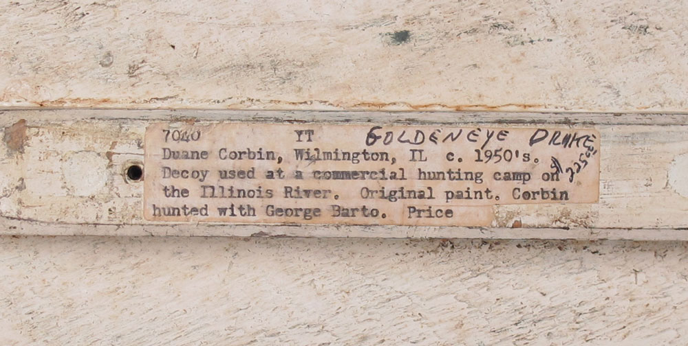 VINTAGE DUANE CORBIN GOLDENEYE DUCK DECOY: Goldeneye drake working decoy, original paint, from the Illinois River area. Glass eyes. 8'' h. x 13 1/2'' x 6 1/2''.