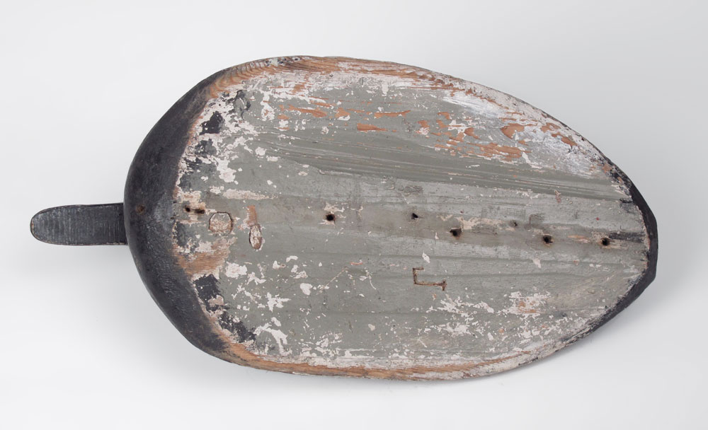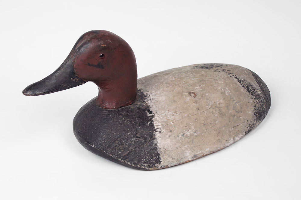 VINTAGE CANVAS BACK DRAKE DUCK DECOY: Unknown maker and region working decoy. Original paint, glass eyes. 6 3/4'' x 15 1/2'' x 7 1/4''.