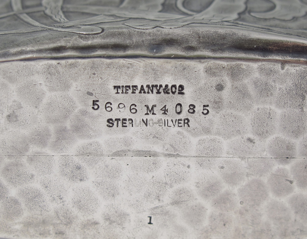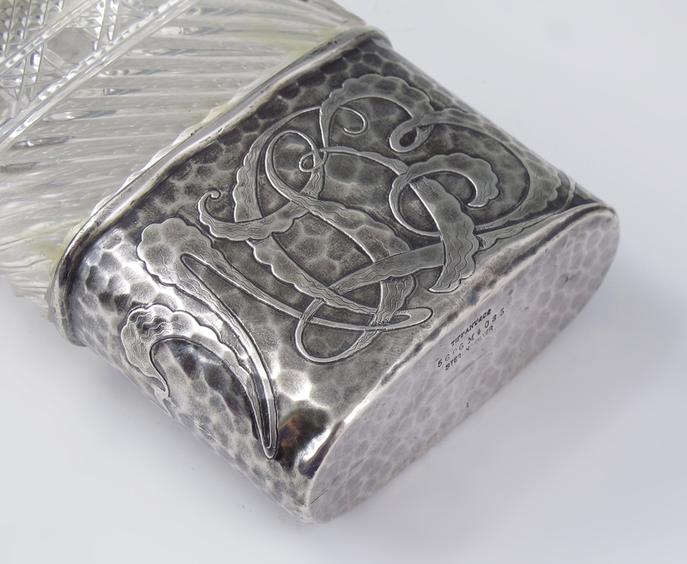 TIFFANY & CO. HAND HAMMERED STERLING FLASK: Hand hammered base with cut glass top, sterling screw top. Stylized WLB monogram on base. Marked Tiffany & Co., 5696 M 4085, Sterling Silver. Measures 5'' h. x 2 3/4''.