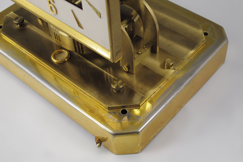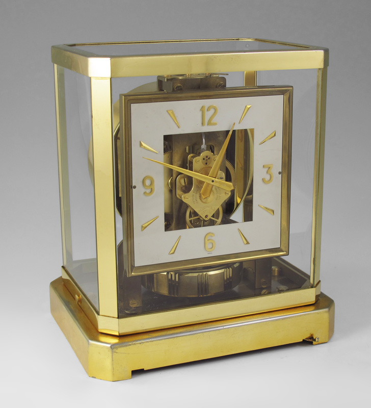 1950'S LECOULTRE ATMOS CLOCK: Serial number 114774 dates to late 1950's, Brass frame case with glass on all sides. Marked Le Coultre & Cie Atmos on front of movement. Measures 9 1/4'' h. x 8 1/4'' x 6 1/2''.