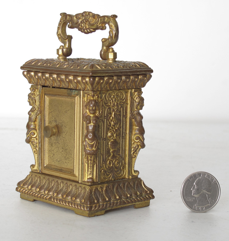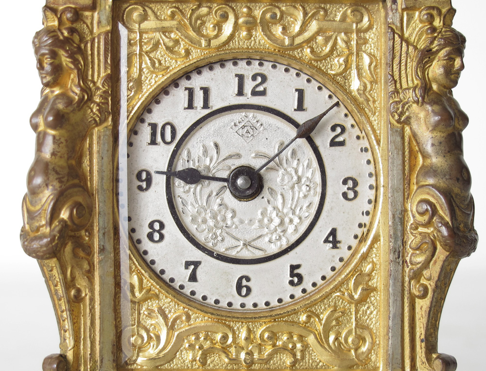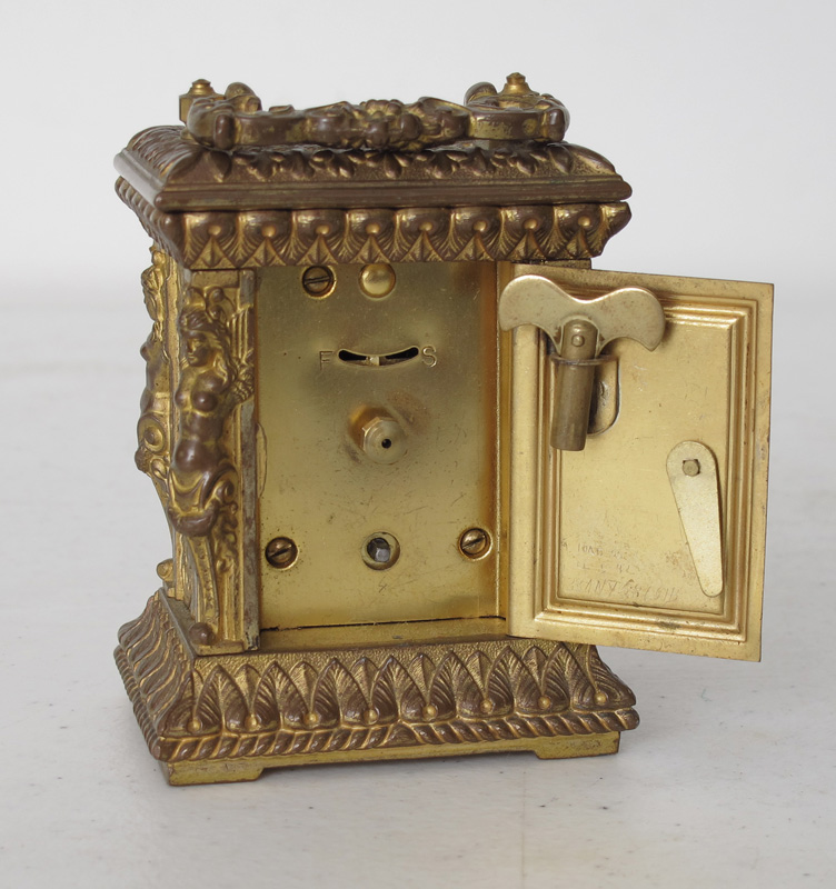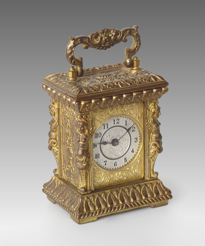 GILT ANSONIA COMET FIGURAL CARRIAGE CLOCK: Cast metal case with gilt finish, profusely decorated with figural maidens at corner. Embossed dial with Arabic numerals, Ansonia trademark. Original key remains. Measures 3 7/8'' h. x 2 3/4'' x 2 1/4''.