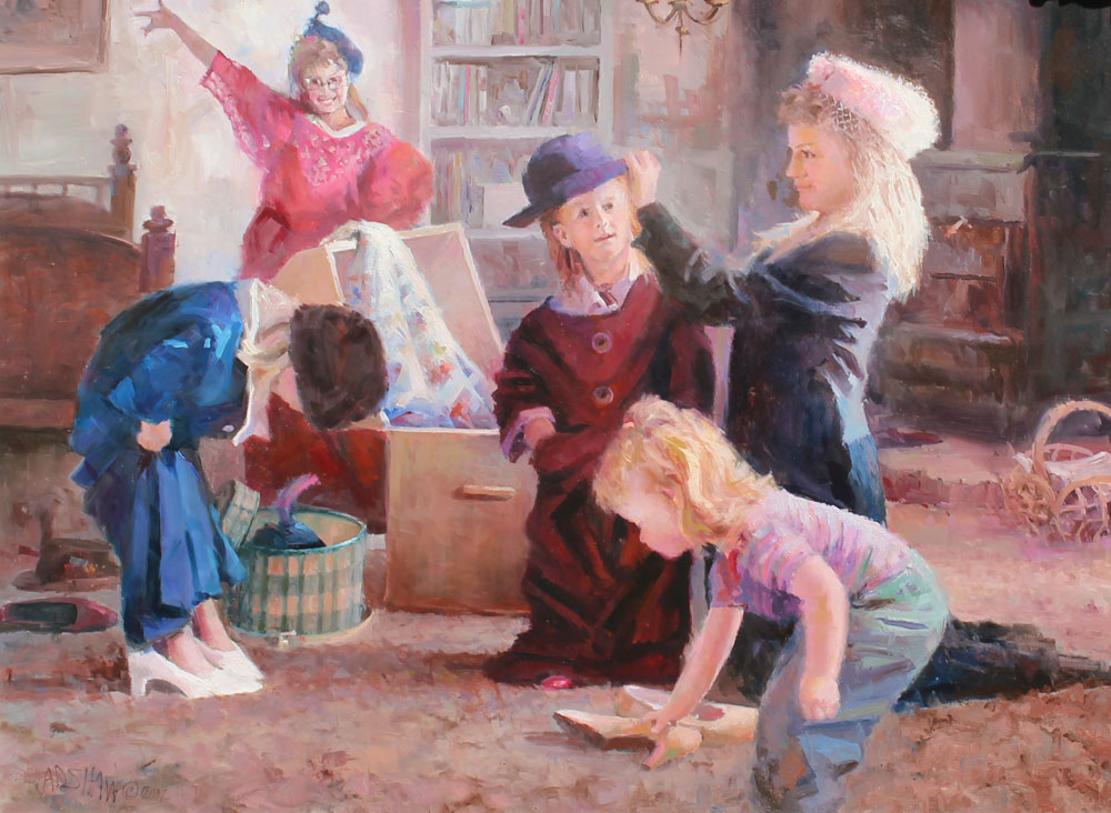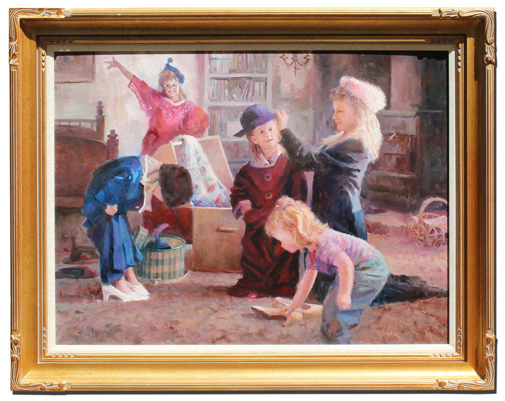 SHAW, A.D., (American, 1933-): ''Dress Up Party'', Oil/Board, 30'' x 40'', signed lower left, signed and titled verso, encased in a custom impressionist gilt carved frame, 38'' x 48''. Original May Gallery receipt for $7,100.00, and other artist promotional materials included.