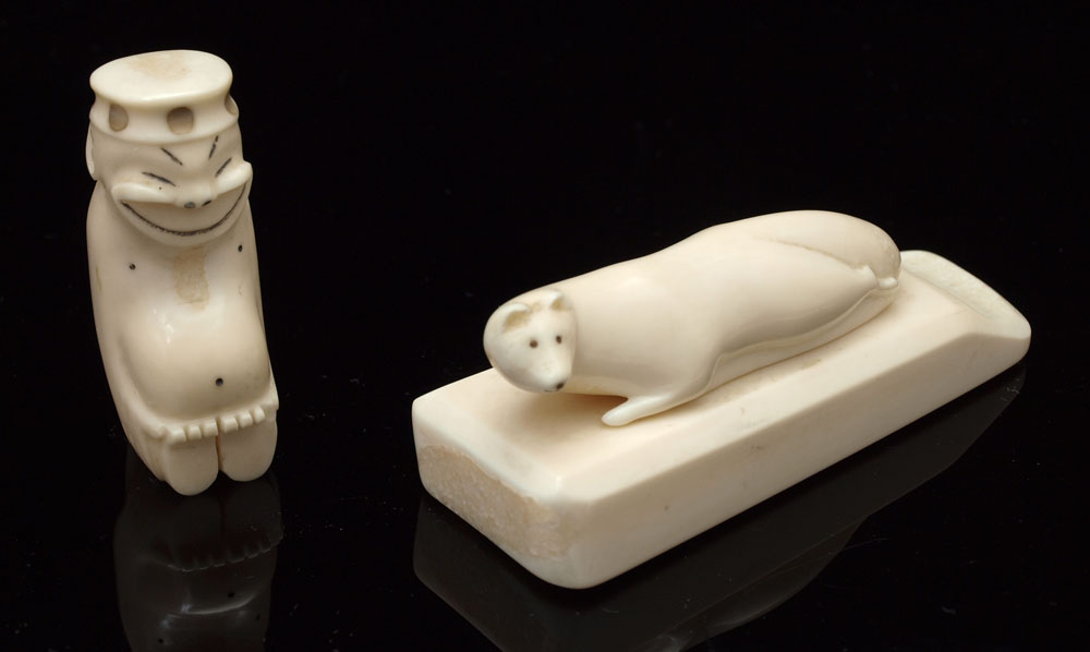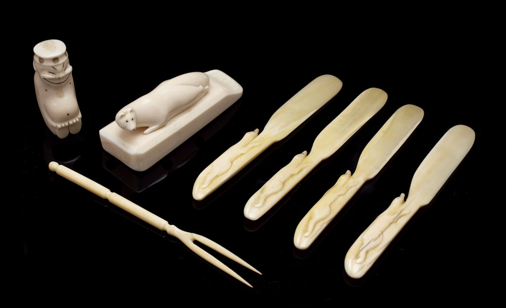 COLLECTION OF INUIT IVORY CARVINGS: To include carved model of a fox (1 1/2'' h. x 4 1/4'' x 1 1/2''), carved Billiken figure (2 1/2'' h.), 5 piece fish spread set with carved fox figure on handles of knives (knives 6 3/8'' l., fork 6 1/4'' l.)
