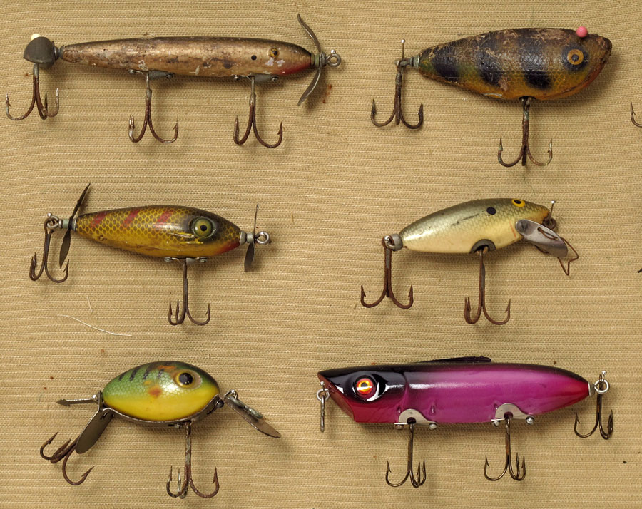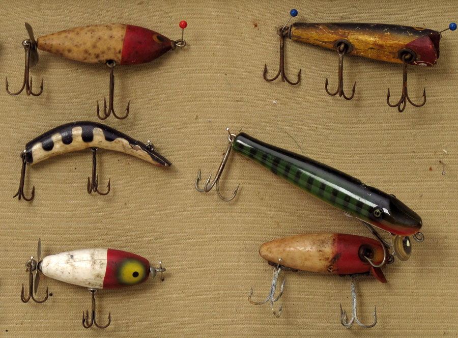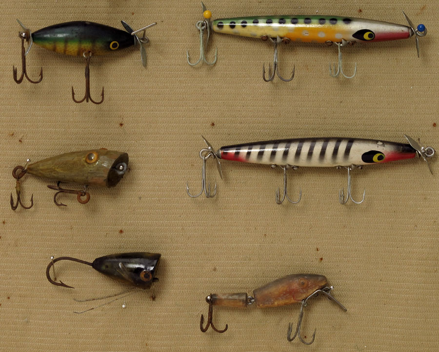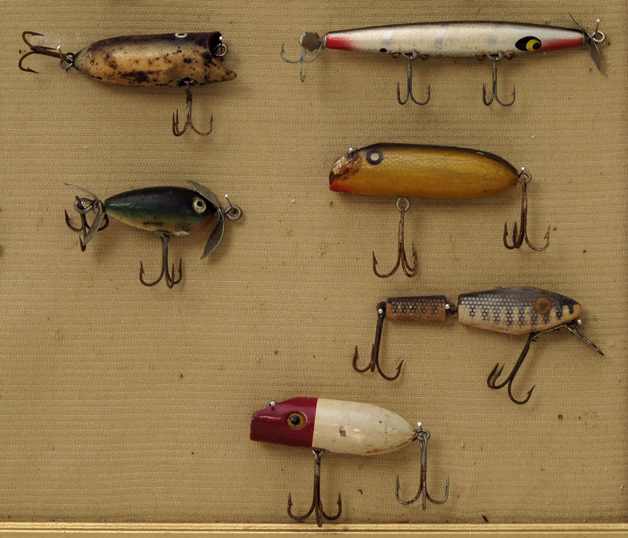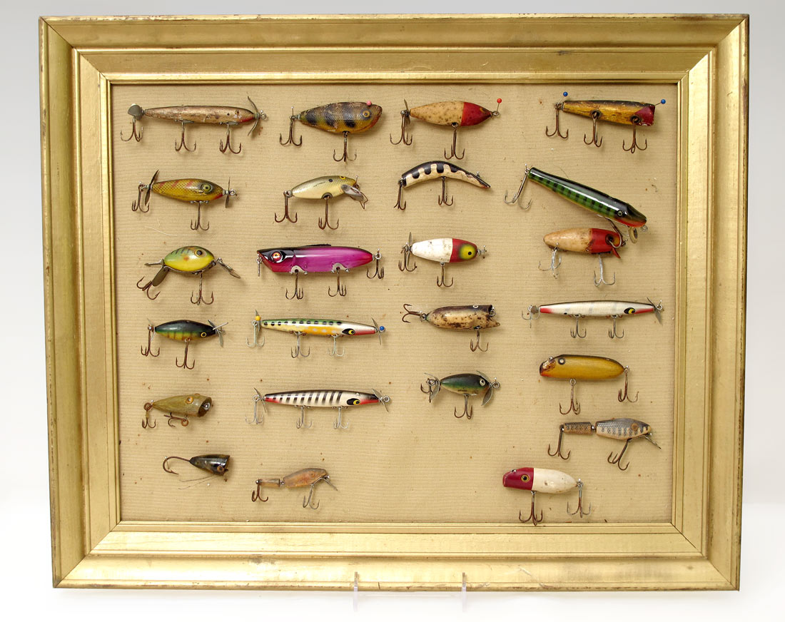 FRAMED COLLECTION OF VINTAGE FISHING LURES: 24 vintage fishing lures by assorted makers and styles. Mounted to board and framed, longest lure 4 3/4'' l.