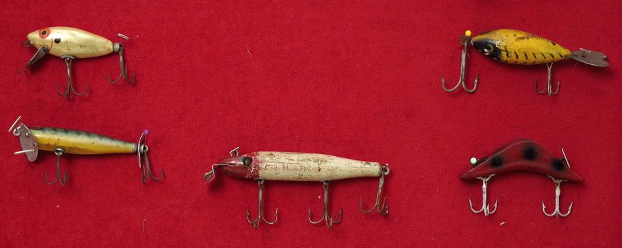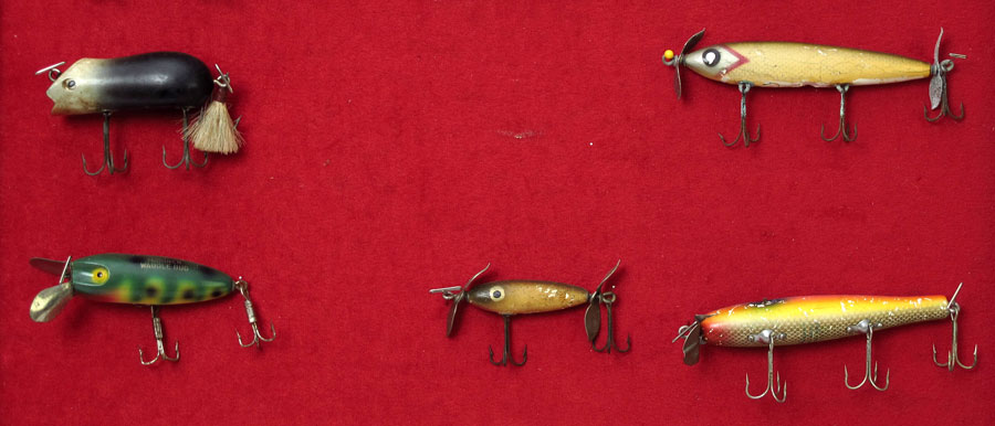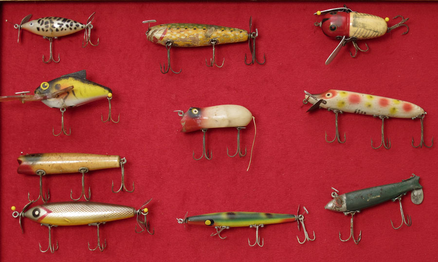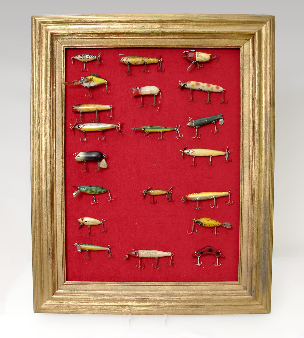 FRAMED COLLECTION OF VINTAGE FISHING LURES: 19 vintage fishing lures by assorted makers and styles, to include Heddon, Makinen, Shakespeare. Mounted to board and framed, longest lure 5 1/4'' l. Mounted to board and framed 31'' x 25''.