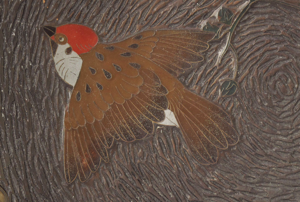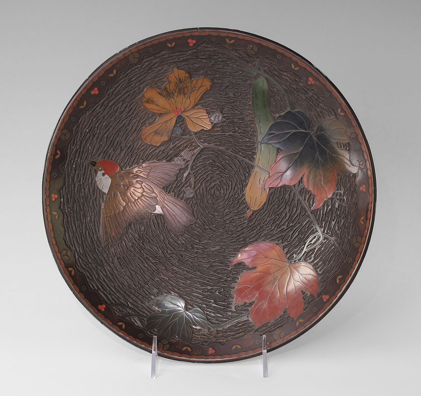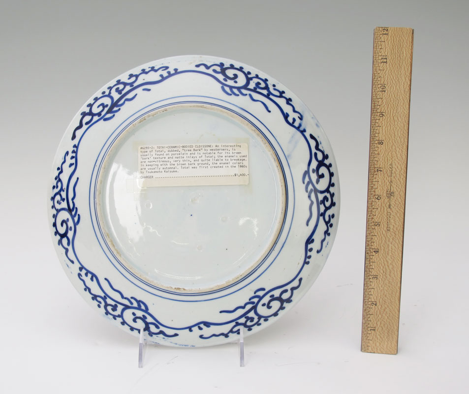 TOTAI TREE BARK CLOISONNE CHARGER: Cloisonne on porcelain blue and white base with birds, flower, leaf, and gourd motif in Autumn colors. 11 1/4'' dia.
