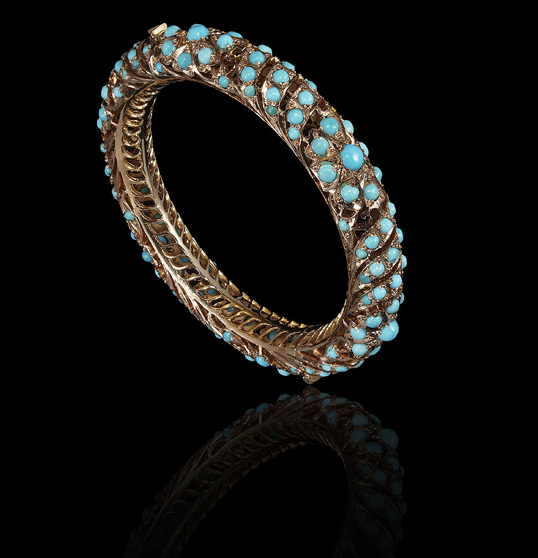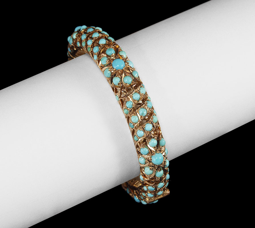 9K GOLD AND TURQUOISE BANGLE BRACELET: 9K yellow gold hinged bangle bracelet contains 2.00 - 2.50 mm round cabochon cut pieces of turquoise. The turquoise is knife set. Diameter 2.25''. Weight: 47.6 grams.