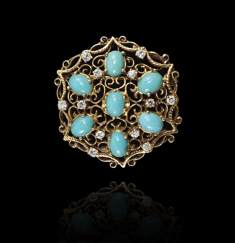 TURQUOISE & DIAMOND FANCY SCROLL FILIGREE BROOCH/PENDANT: 14K yellow gold brooch/pendant contains seven 7.00 x 5.00 mm oval cabochon cut pieces of turquoise. In the mix are 12 round brilliant cut diamonds totaling approx. .60 Ct. Rated VS-SI in clarity and H-I in color. The turquoise and diamonds are prong set. Bar pin closure and fixed bail. Diam. 1.5''. Weight: 11.3 grams.
