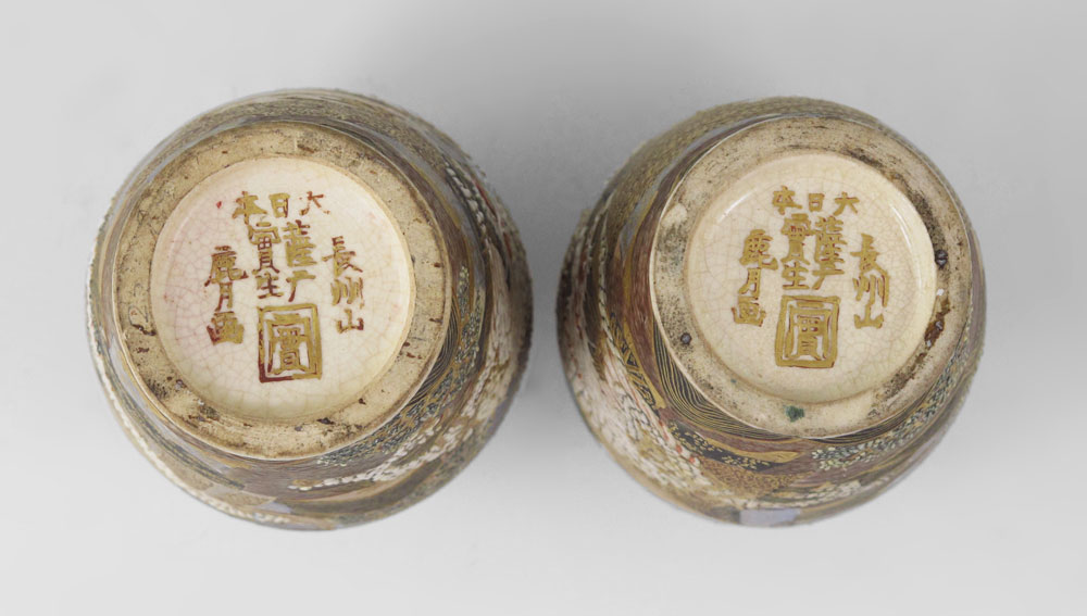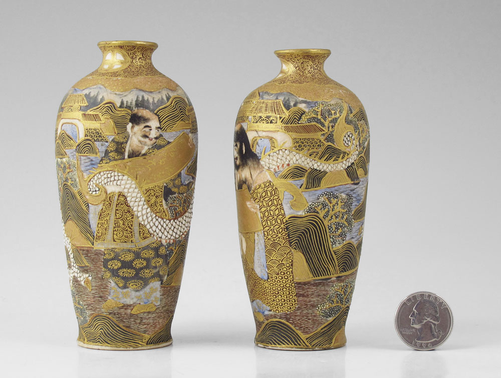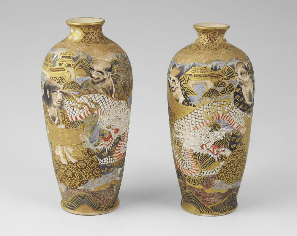 PAIR SIGNED MINIATURE JAPANESE SATSUMA VASES: Figures with scroll, a white dragon in their midst. Signed with Dai Nippon, Satsuma, Jitsu Sei, Choshuzan, Kegetsu Ga and unknown mark. 5'' tall.