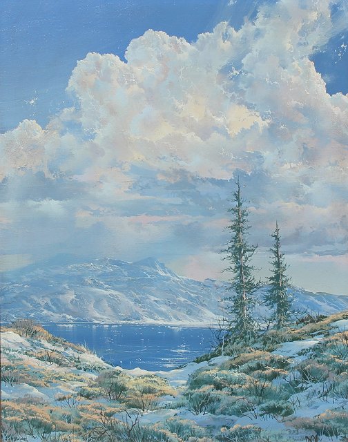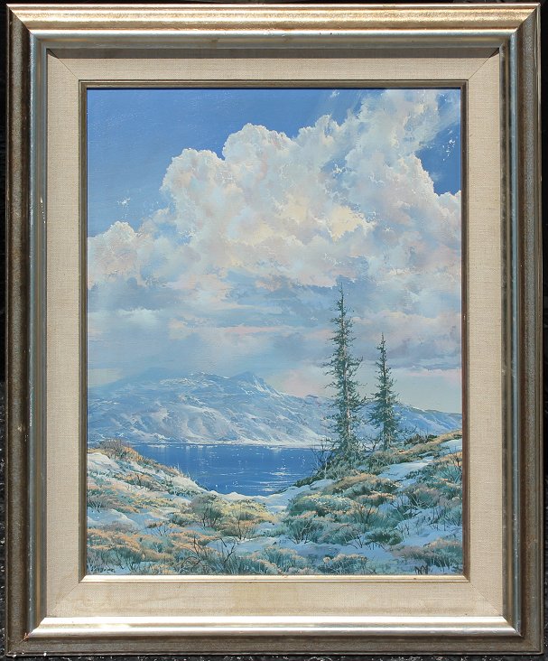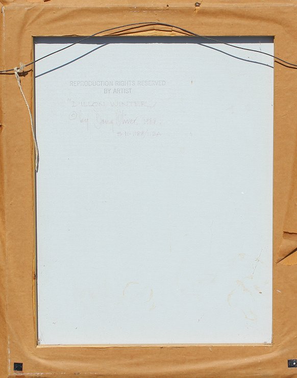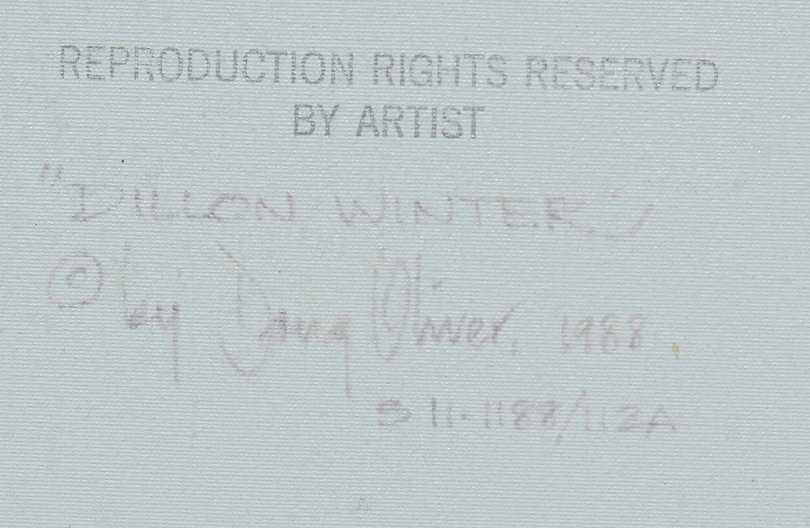 OLIVER, Doug, (American, 20th century): ''Dillon Winter'', Acrylic/Canvas, 20'' X 16'', signed, titled and dated 1988 verso, with artist's inventory #112, with silver gilt frame with wear, 26'' x 21''. Authenticated by the artist, these works routinely sell in the $1,300.00/$1,800.00 range. This painting was completed in November, 1988 - consigned and sold to E S Lawrence Gallery in Aspen, CO.